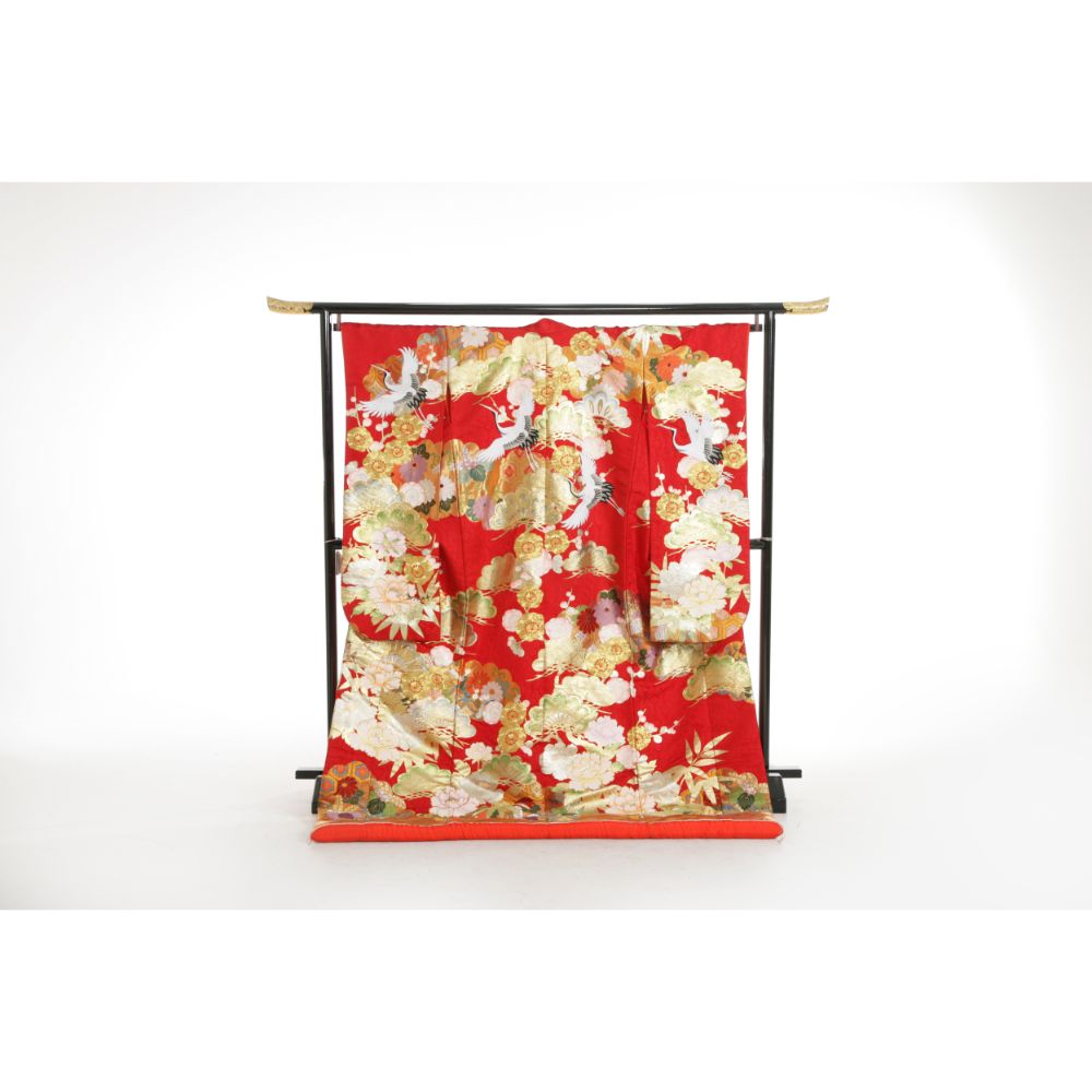 純粋さを感じさせる品の良い赤色地に、日本の伝統植物文の大振りの文様や、対比的に配された小振りの文様の多くに金が施された品の良い豪華さが見事です。飛ぶ鶴も愛らしくデザインされ、赤と金の醍醐味を味わえる雅やかな色打掛。