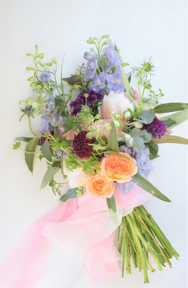 差し色にベージュピンクを使った、大人のナチュラルブーケです。長いリボンも印象的なブーケ。お好みに合わせて、花材を変更できます。