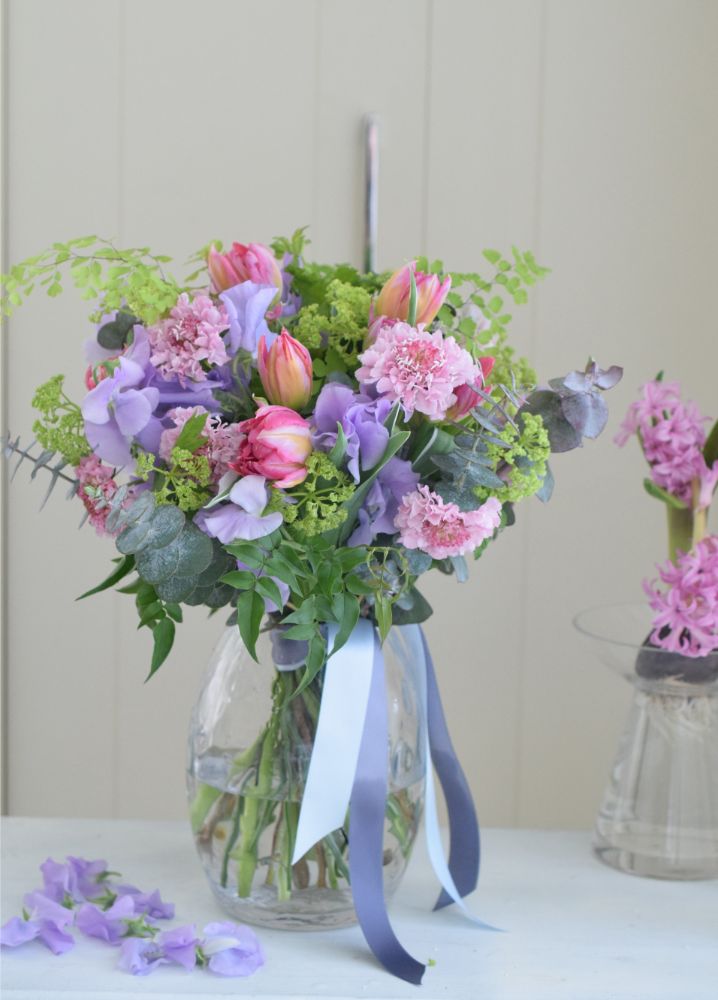 チューリップやスイトピーなどなるのお花をたっぷり使ったブーケ。生花は流通の時期が限られており、毎年その時期は微妙にずれが生じます。