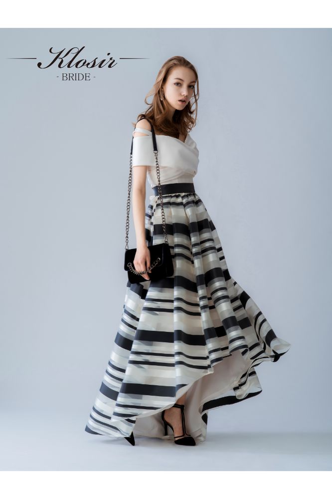 ネイビーホワイトはスタイリッシュでモードに。共通のオフショルダーはドレープが包みモダンなスタイルに。