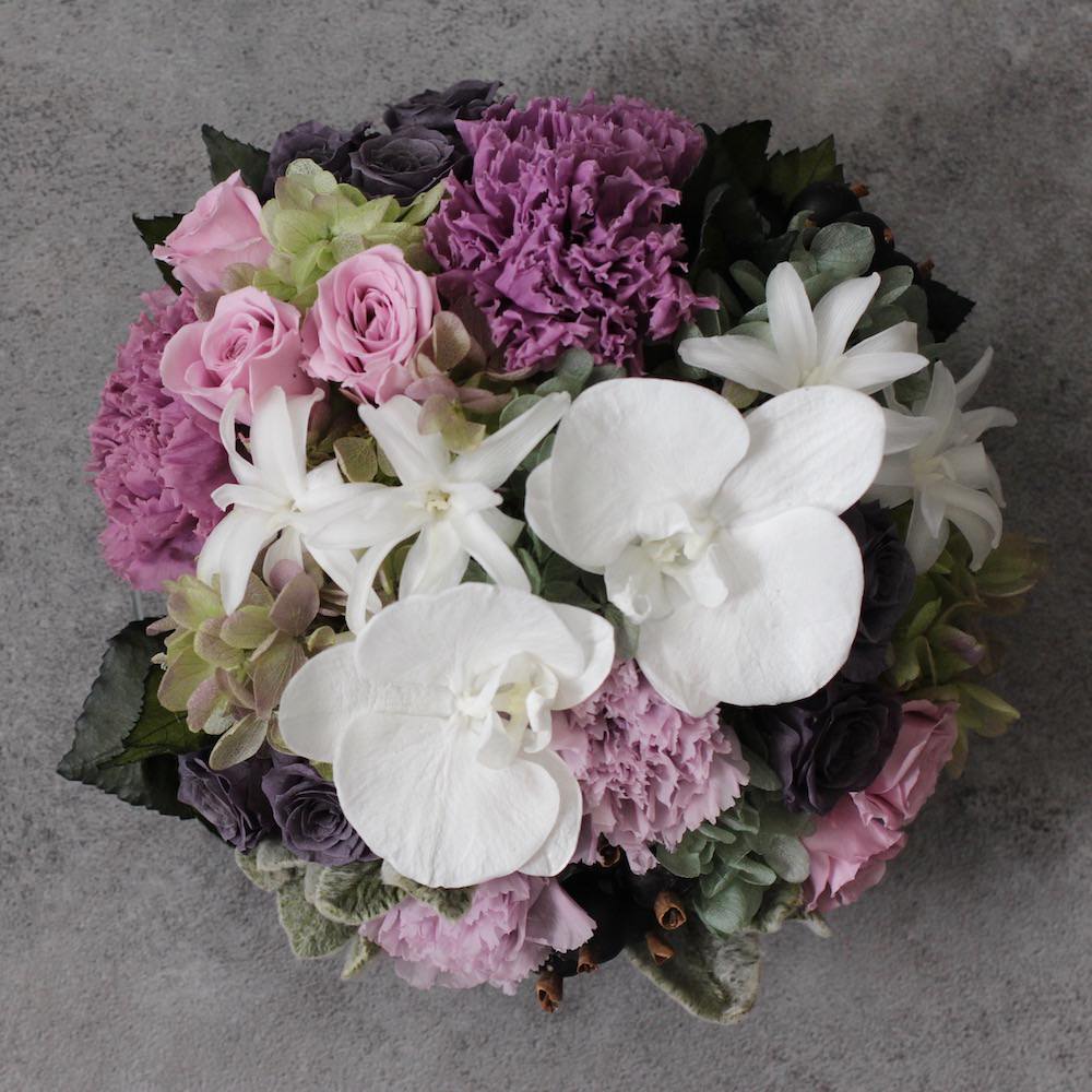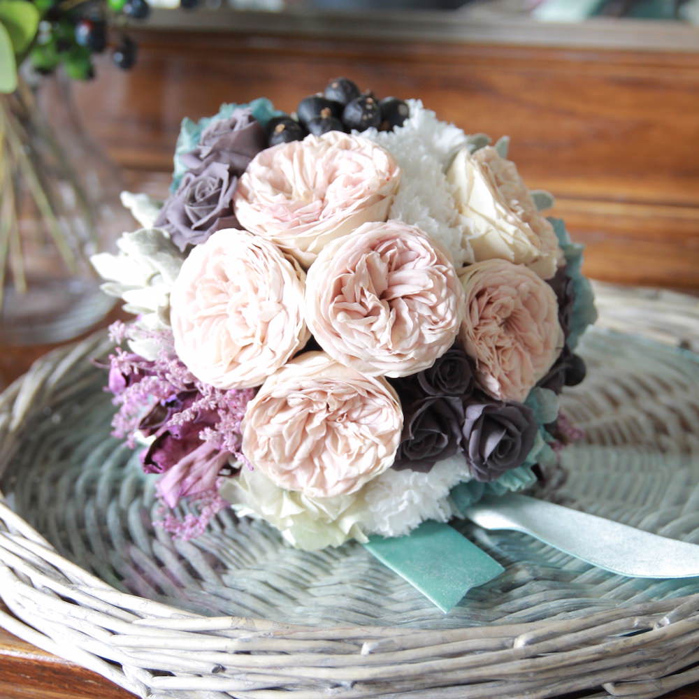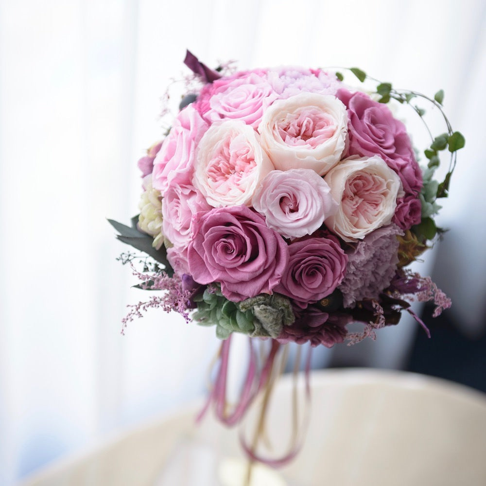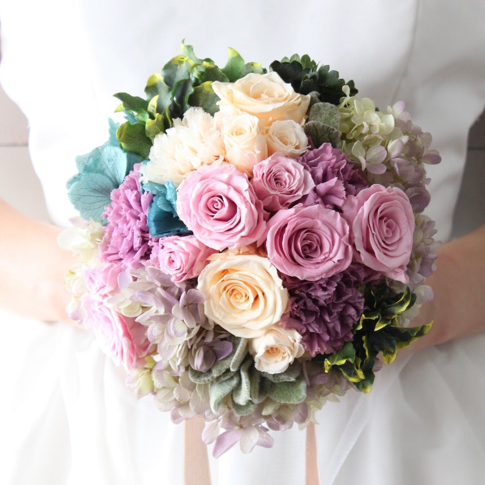 生花を加工したプリザーブドフラワーを活かして、生命感のあるみずみずしさを保ったブーケをお作りいたします。