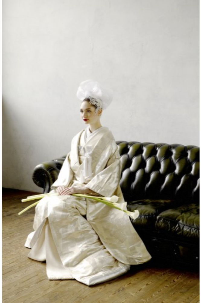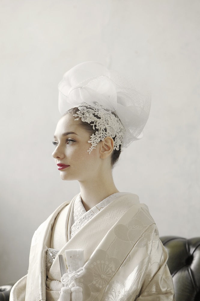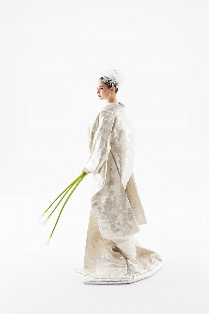 白とシルバーで織り込んだ大輪の梅が優美なアンティーク打掛には、チュールを綿帽子に見立てたヘッドドレスを組み合わせて。伝統とモダンが融合した洗練の白無垢姿に。