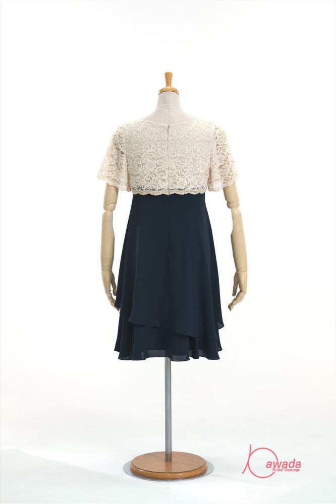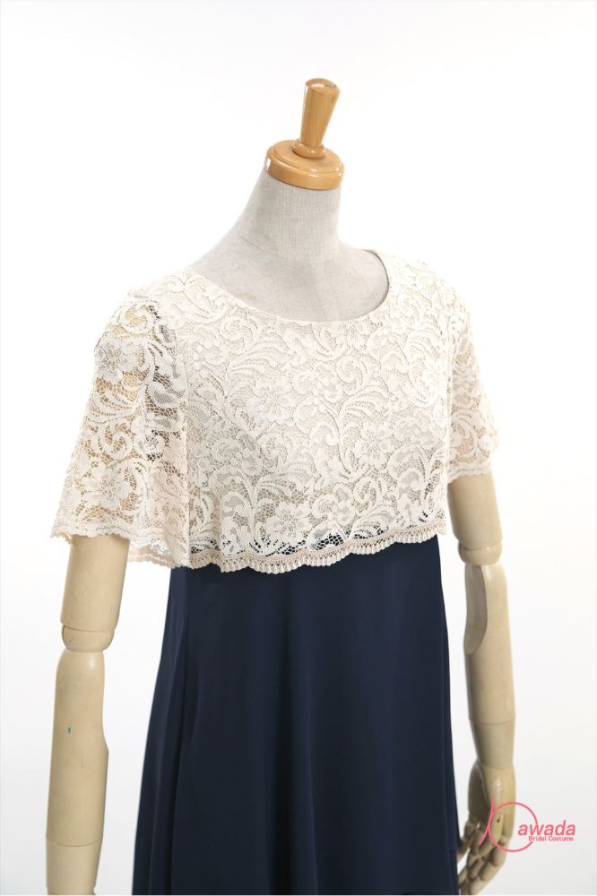 ベージュのレース生地と紺のツートンカラーのドレス。