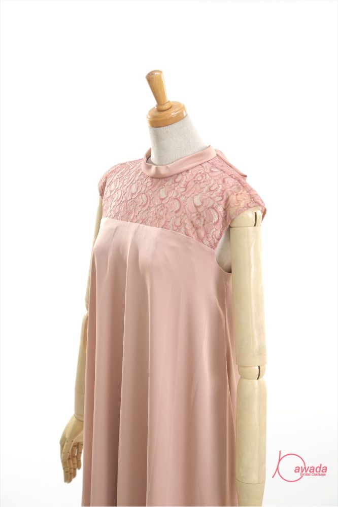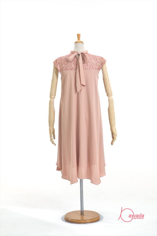ノースリープのサーモンピンクのドレス。バックにリボンのワンポイントあり。