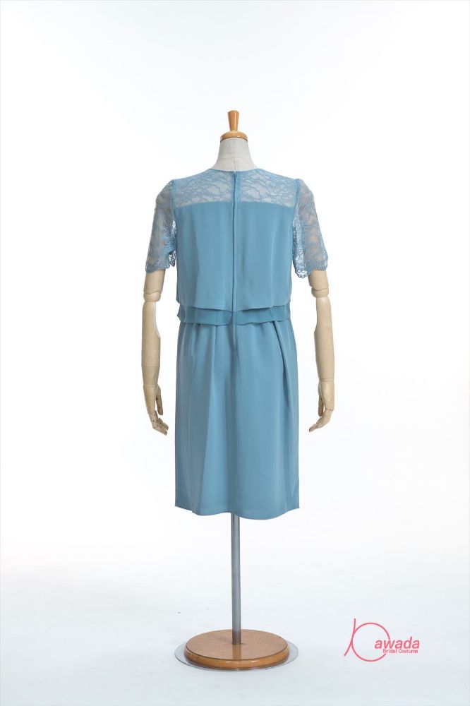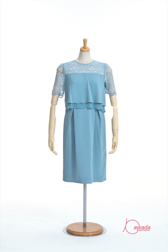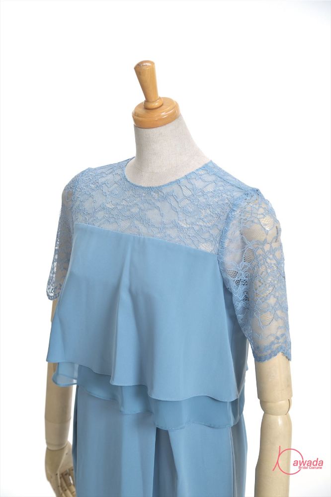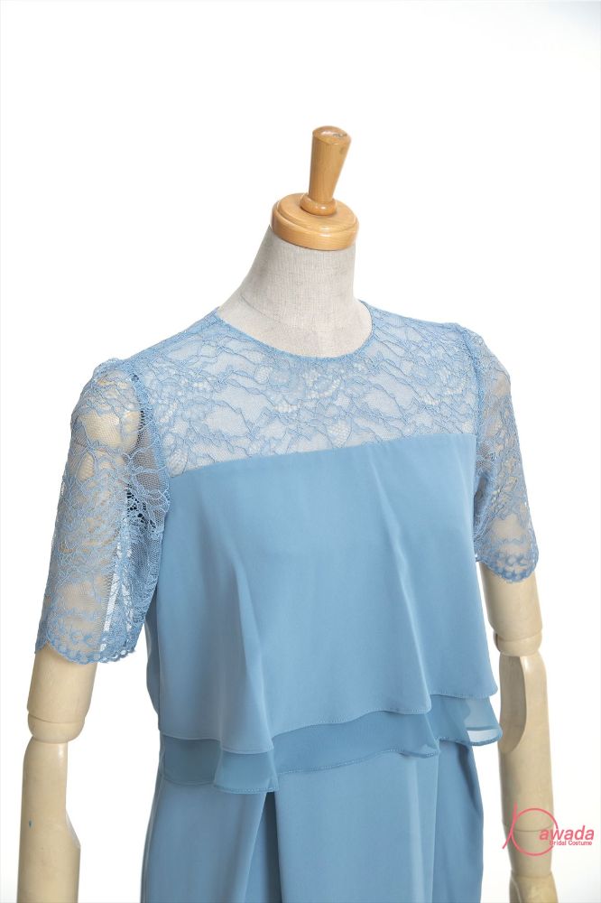 肩から腕にかけてレースがあるブルーグレーのドレス。(色違いあり)