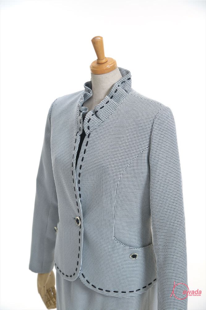 チェック柄 の3ピース。黒の前当ては、ボタンで脱着可能です。気候に合わせて調整できます。