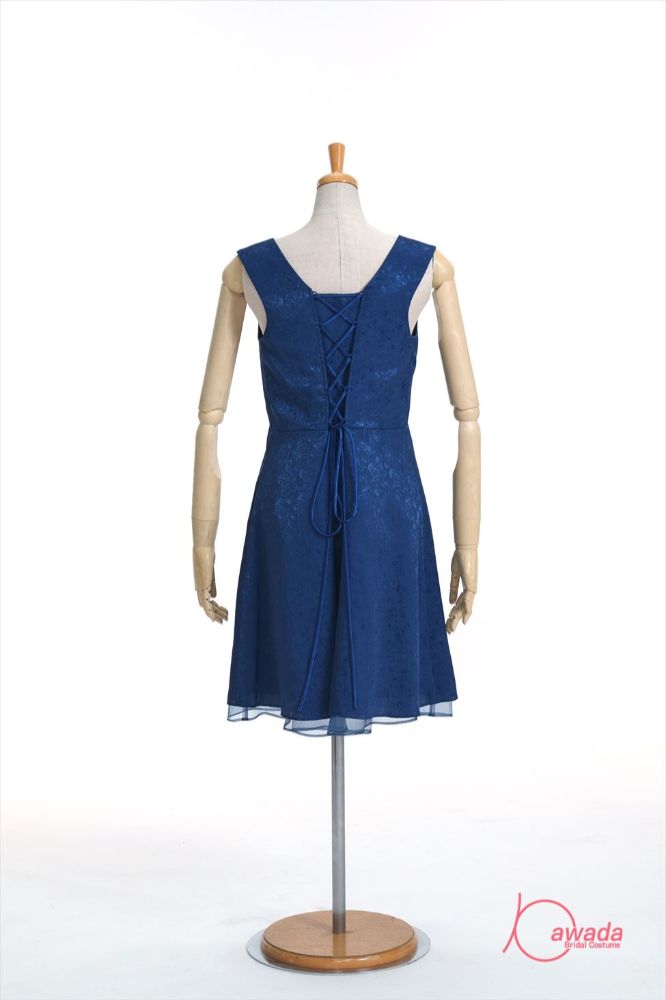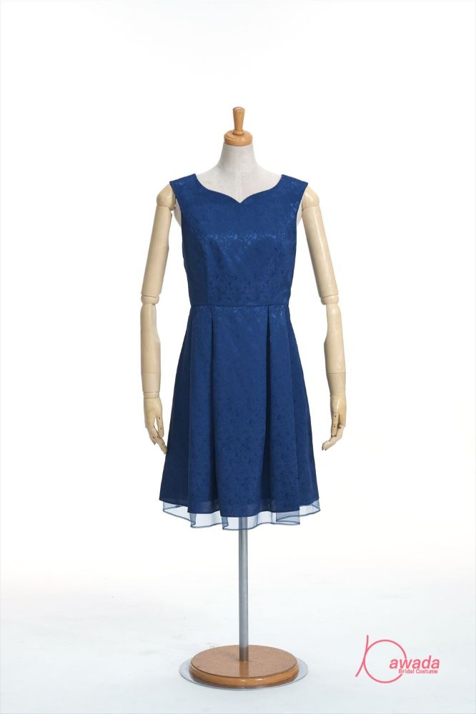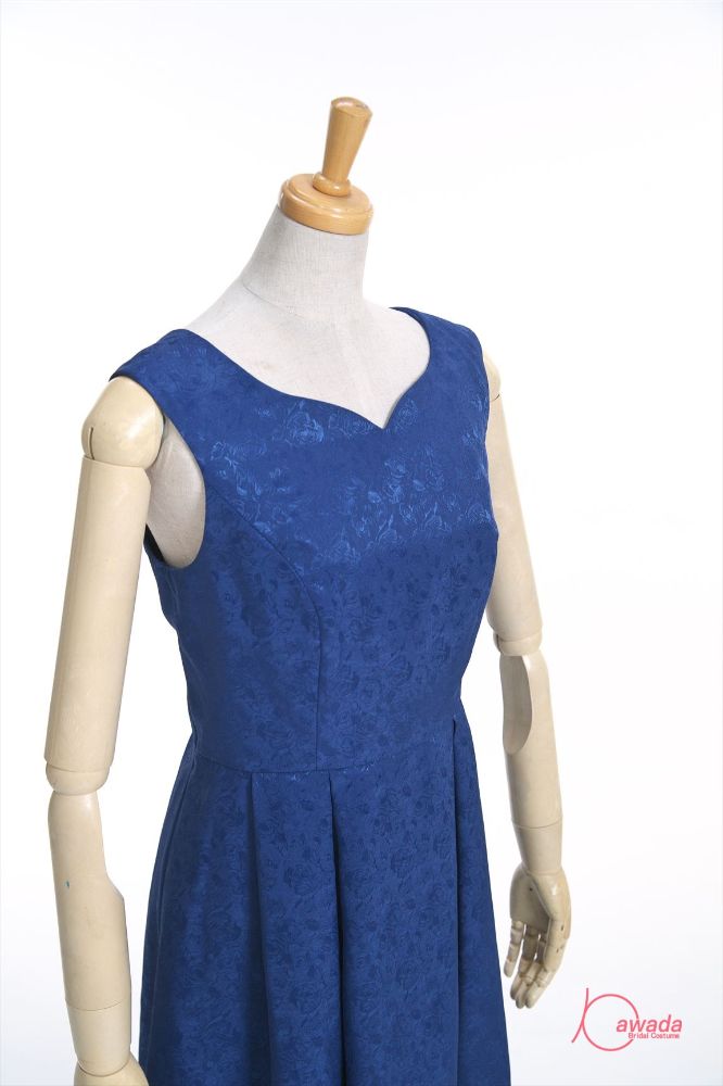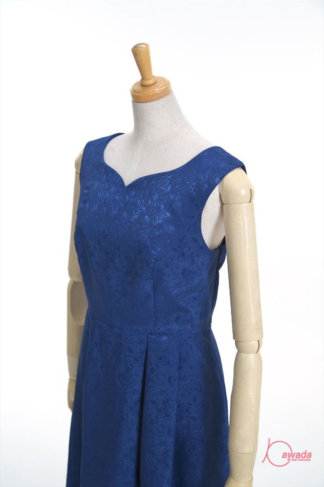 明るい紺のひざ丈ドレス。