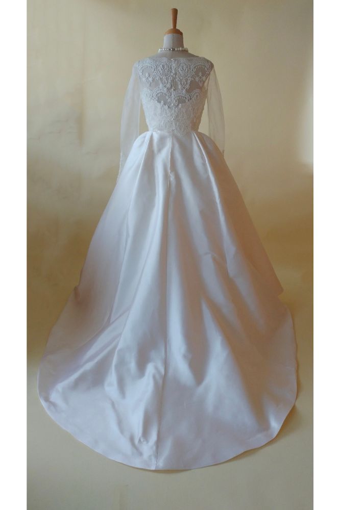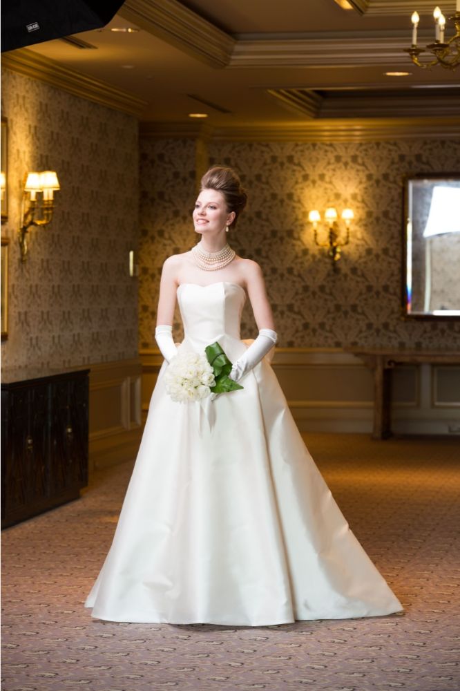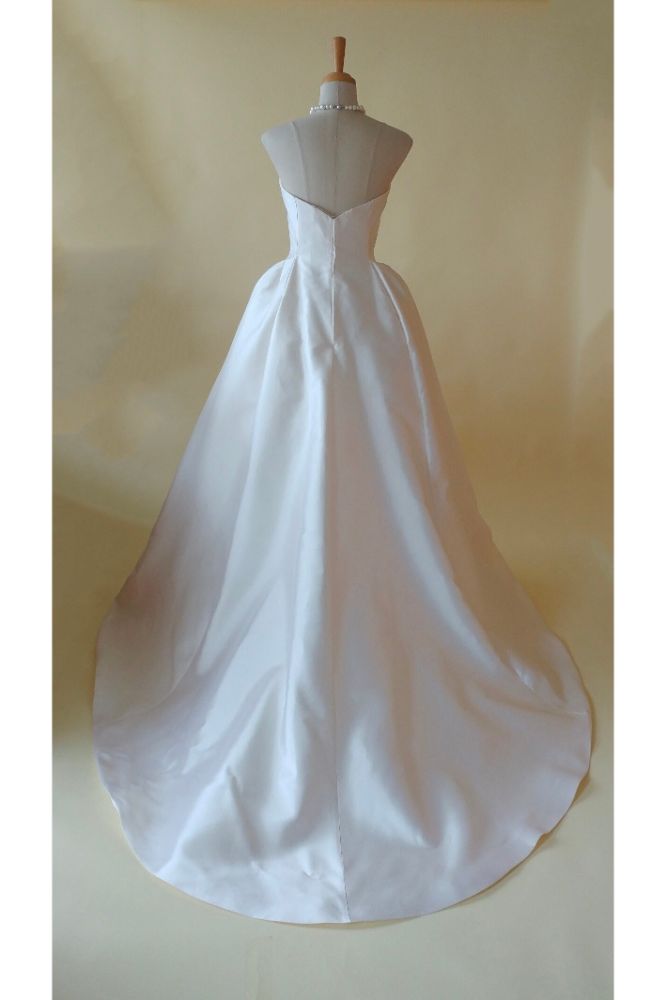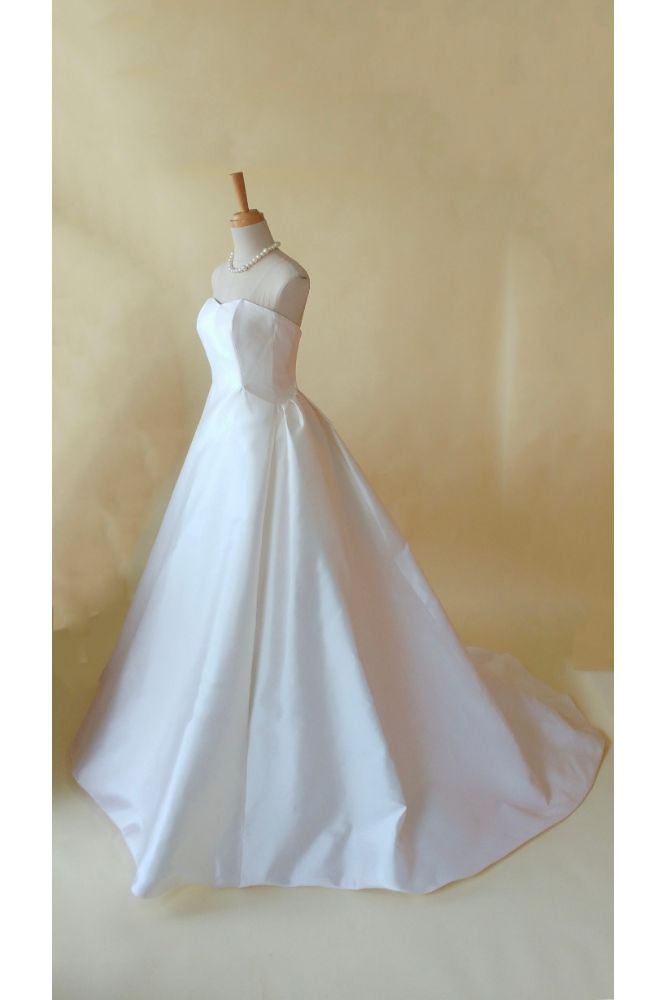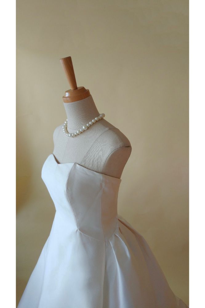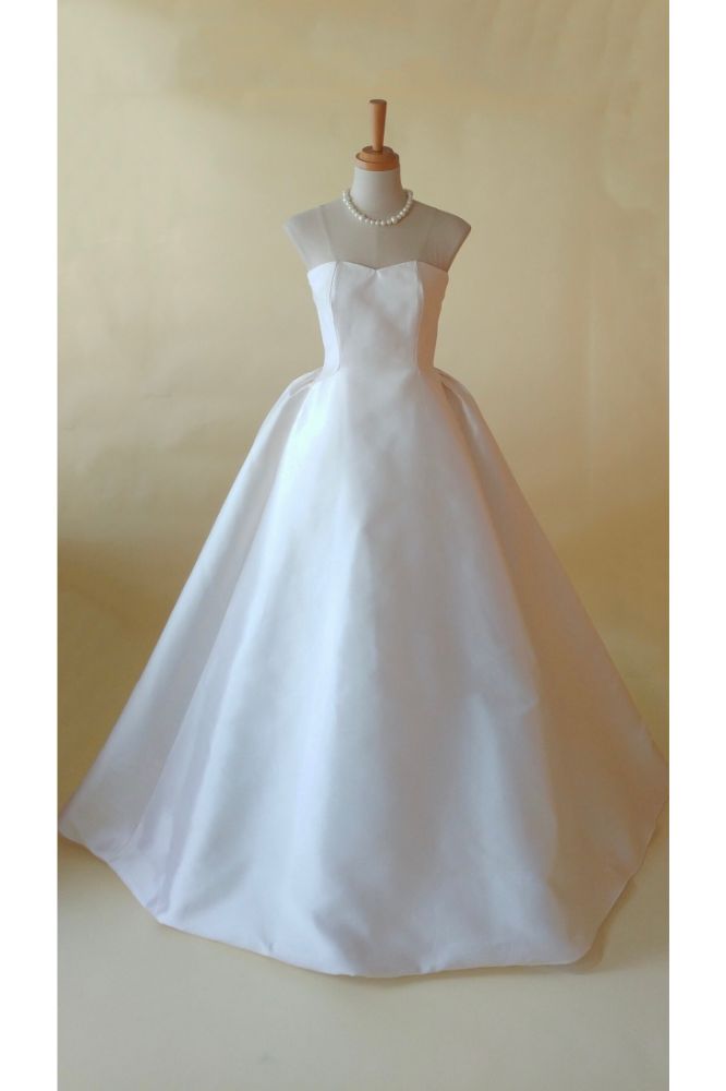 ミカドシルクの構築的なAラインのサイドに甘さを加え、より華やかなプリンセスラインのようなシルエットに。