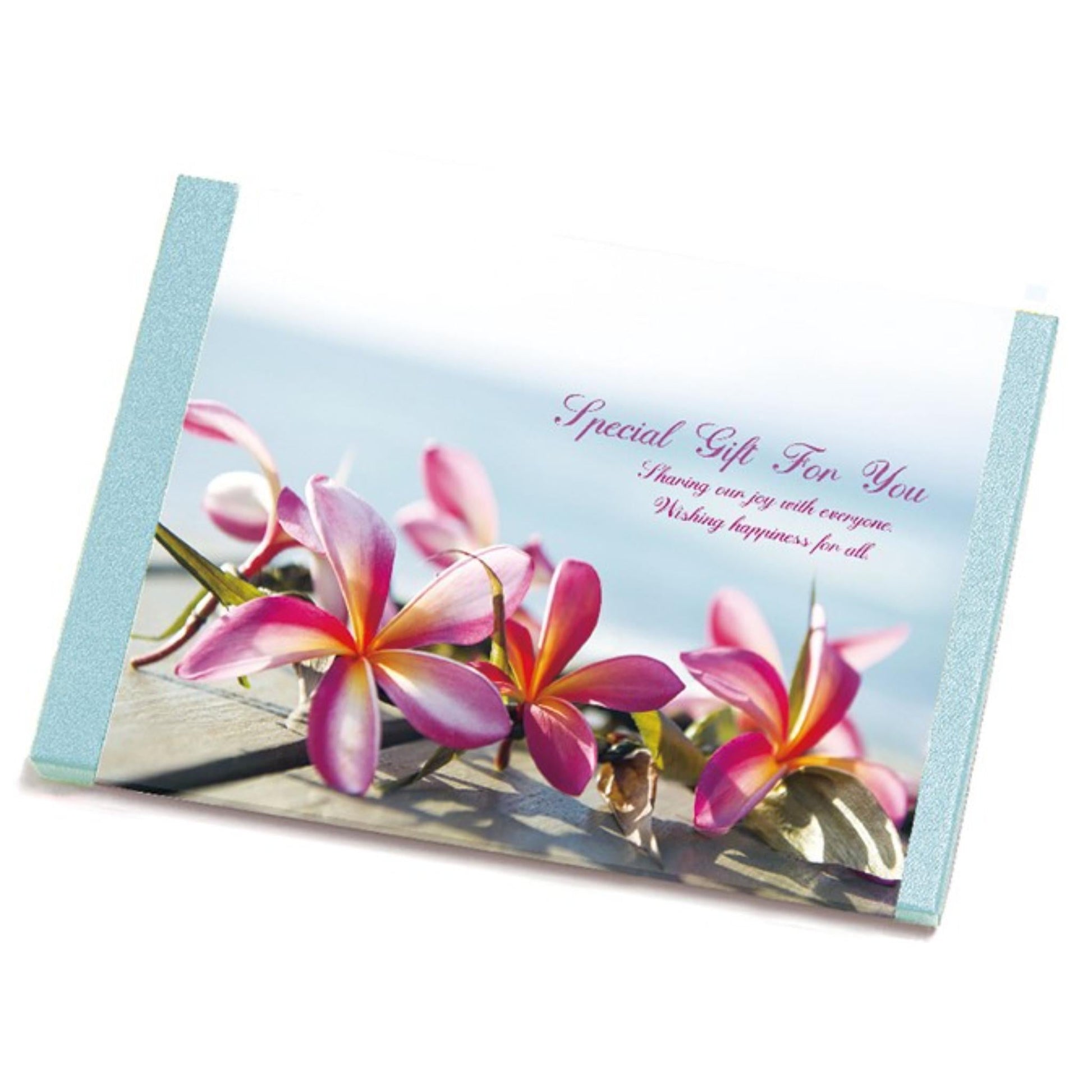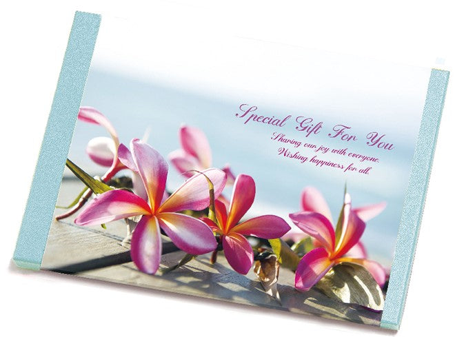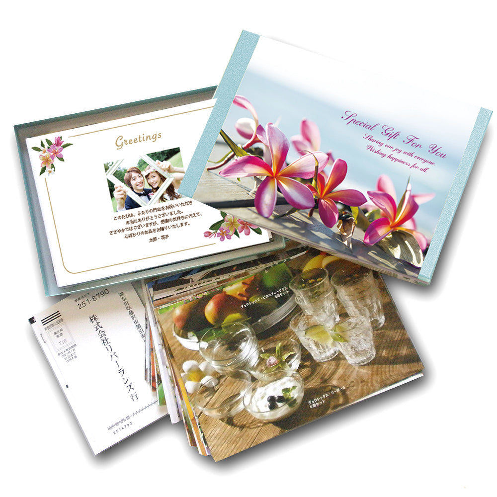 美しい写真に癒され、商品エピソードで発見がある。欲しい物を選ぶことで、リラックスできるカタログギフトです。スプラウト グリーンの箱に艶のある掛紙「プルメリア テラス」で装飾しています。印象的なプルメリアのビビットカラーとリゾートホテルのテラスから眺める水平線。プライベートビーチの開放感が清々しく華やかな印象です。