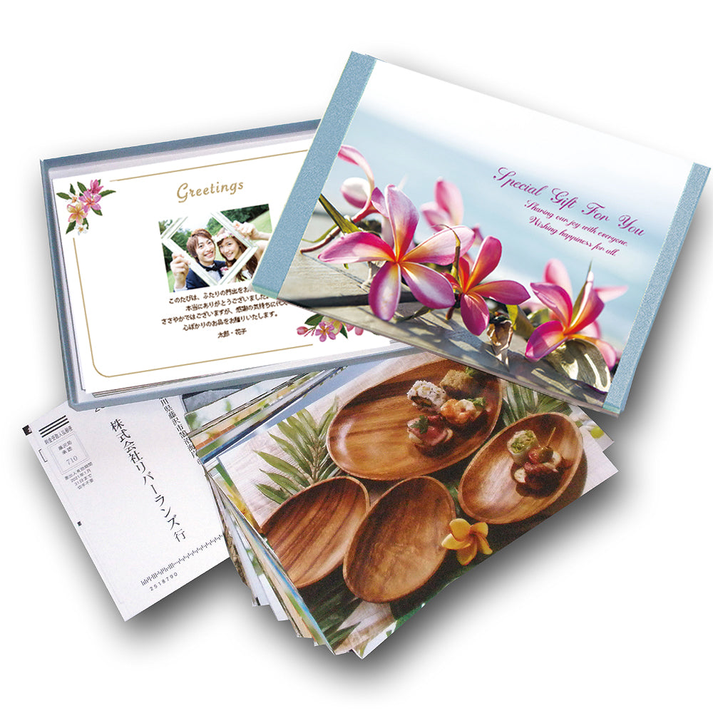 美しい写真に癒され、商品エピソードで発見がある。欲しい物を選ぶことで、リラックスできるカタログギフトです。ペール ブルーの箱に艶のある掛紙「プルメリア テラス」で装飾しています。印象的なプルメリアのビビットカラーとリゾートホテルのテラスから眺める水平線。プライベートビーチの開放感が清々しく華やかな印象です。