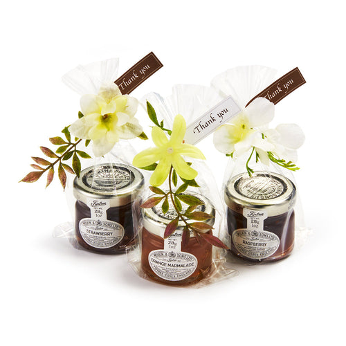 英国王室御用達の高級ジャム。歴史を感じつつ、スタイリッシュなイギリスらしいパッケージ。ホワイト×グリーンの可憐な花飾りとThank Youのタグが付いています。ジャム数種類をアソートした30個セットです。