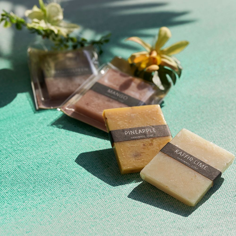 南国のフルーツやハーブがブレンドされたナチュラルな色彩と香り。天然グリセリンで洗い心地がしっとりする手作りのゲストソープです。