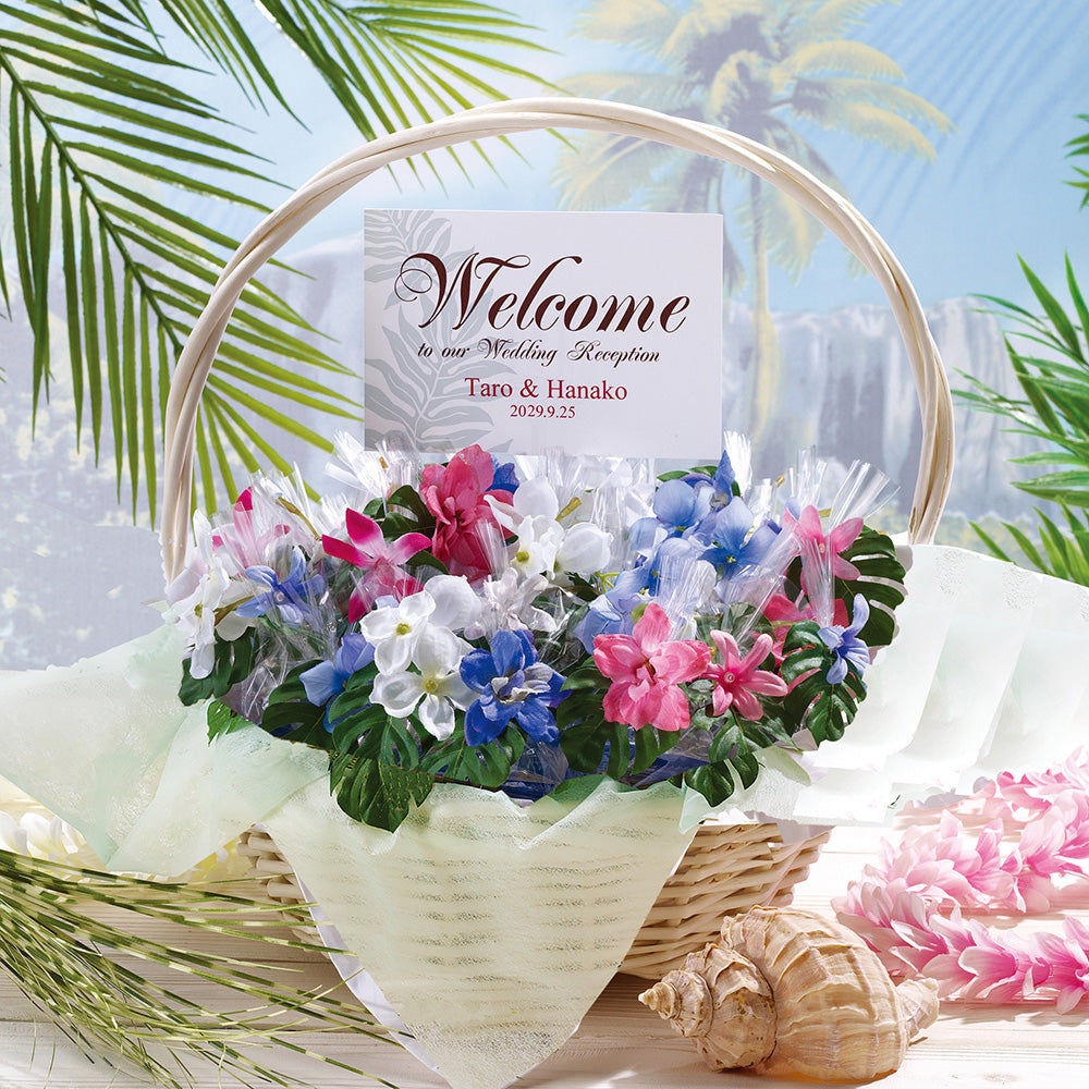 ウェルカム プレート付きバスケットセットは、アレンジフラワーの様に盛り付けてお届けします。受付に置くだけでリゾートの雰囲気が演出できます。