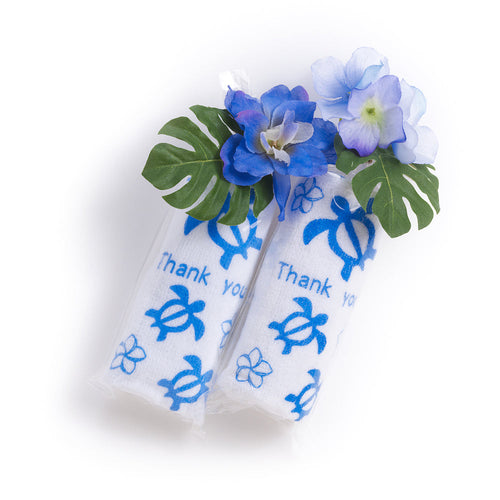 美しさと信頼を意味するハイビスカスと守り神ホヌアオウミガメのミニタオル。Thank Youメッセージ入り。