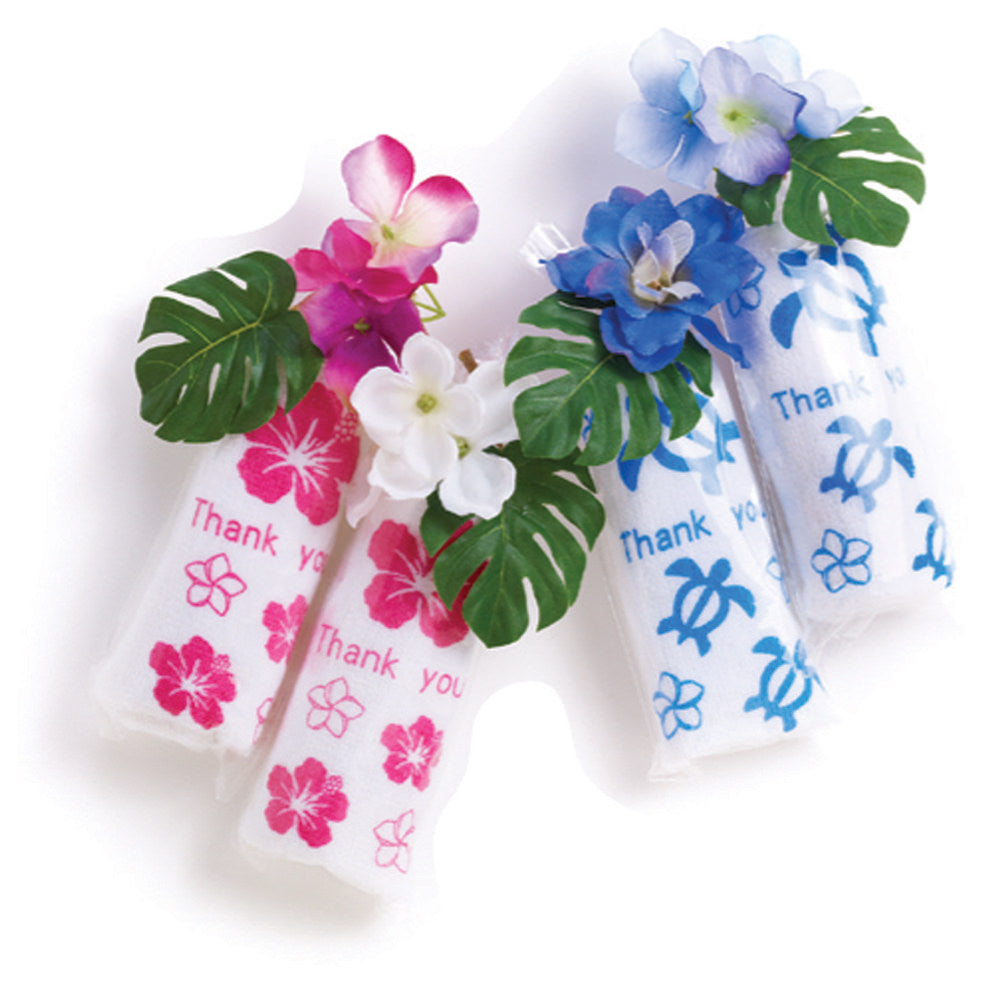 トロピカルフラワーとティーリーフ、モンステラで飾られたミニタオル40個セットピンクハイビスカス20個/ブルーホヌ20個です。