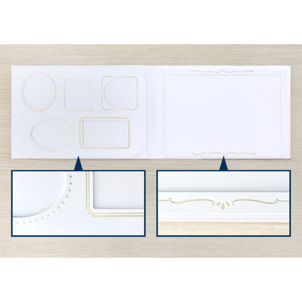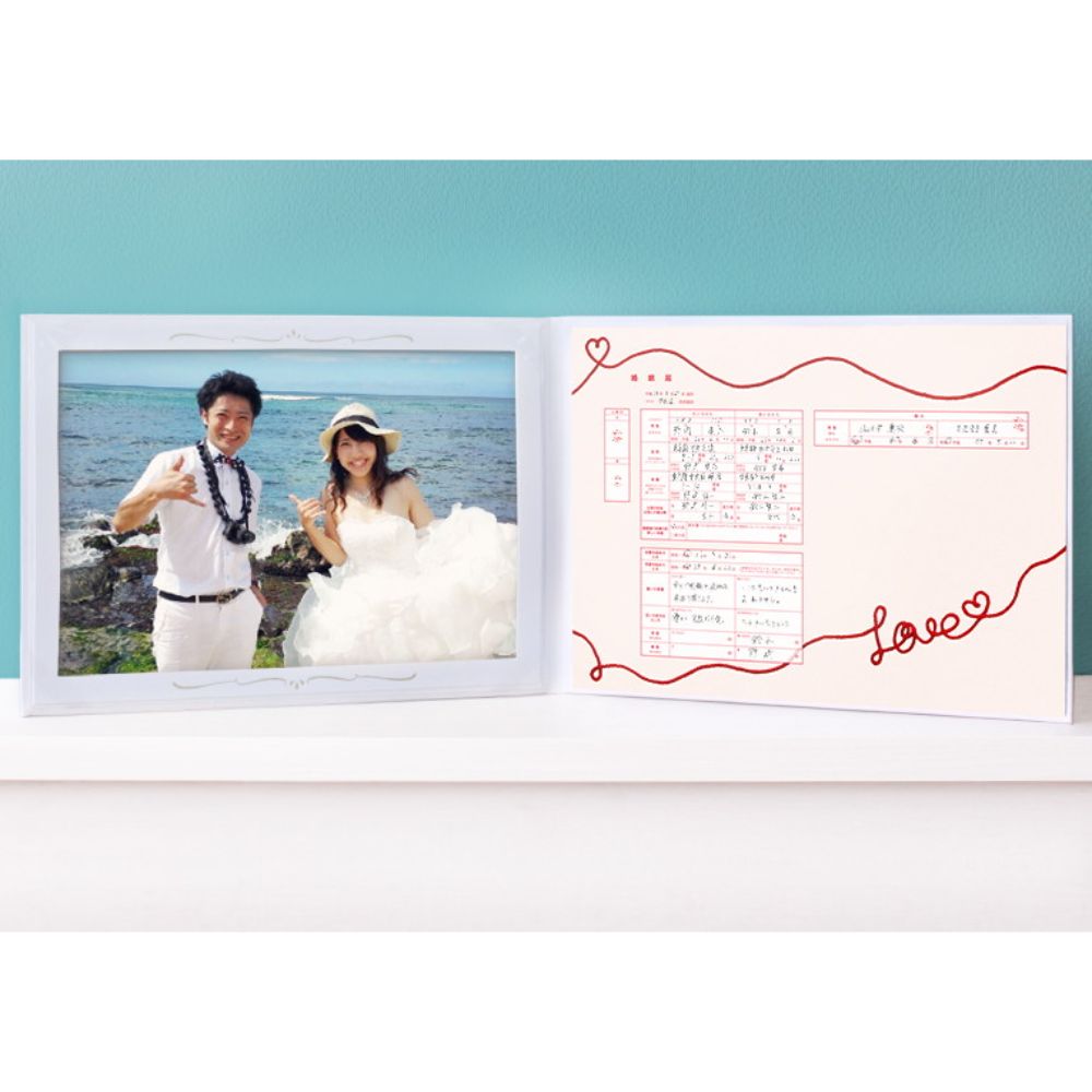 記念保存用婚姻届と写真を飾れる見開き型のアルバム。保管にもおすすめ。