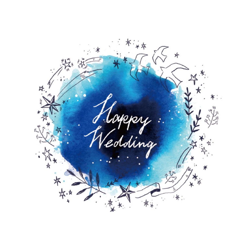 コバルトブルーの空に舞う鳥たちときらめく星々 手描き感あふれるイラストが魅力的なデザイン 7月7日・七夕入籍にもおすすめです