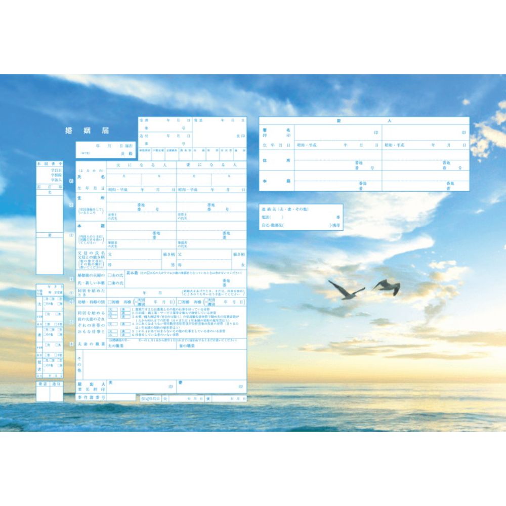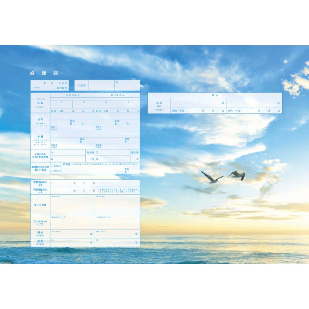 朝焼けの海に、カモメの夫婦が寄り添いながら飛び立つシーン