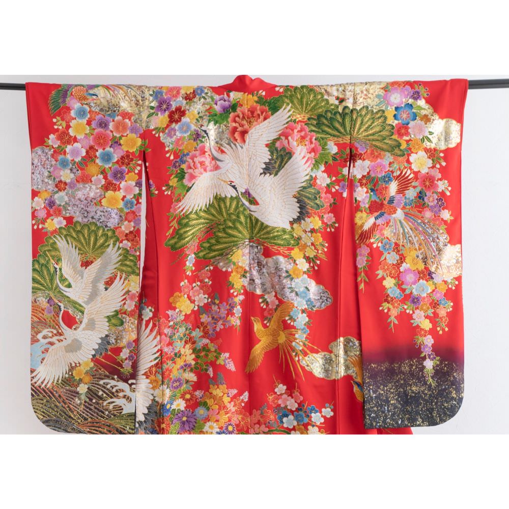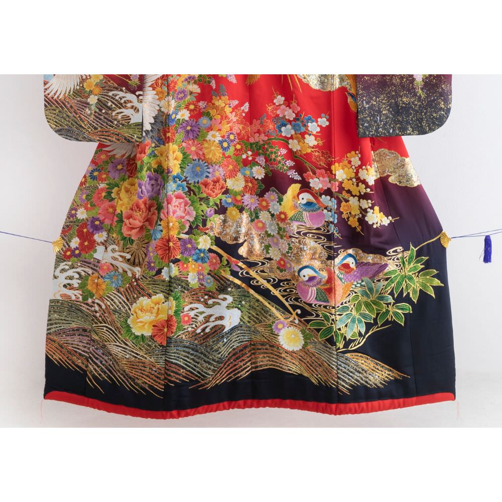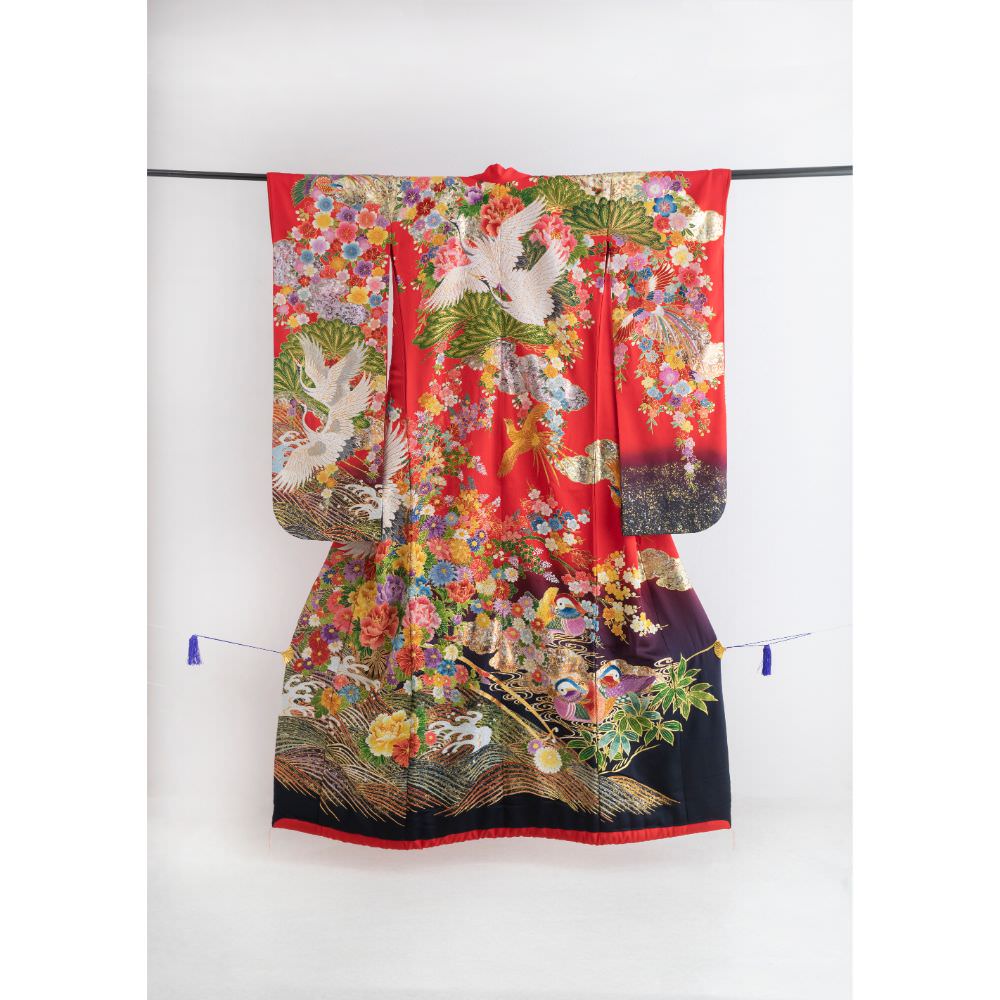 赤地に鶴・四季花・オシドリ柄の色打掛です。色彩も豊かで色の強弱によるグラデーションも豪華で絵画のような1枚です。