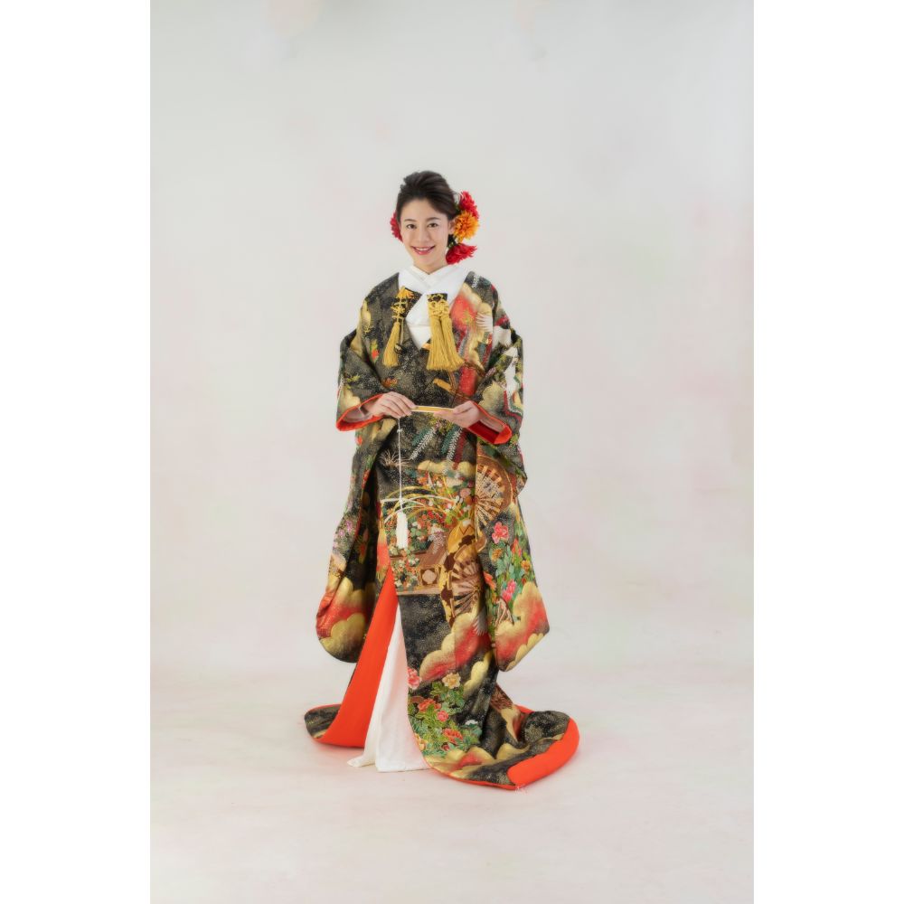 黒字に鶴、金雲、御所車、四季の花々のとても華やかに見えるステキな打掛けです。