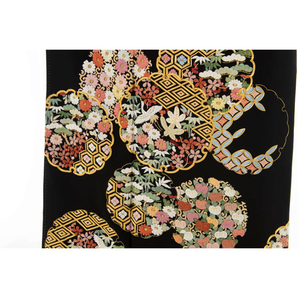 黒留袖です。裾に刺繍で宝尽くしが描かれています。五つ紋で、フォーマルな場でお使い頂けます。