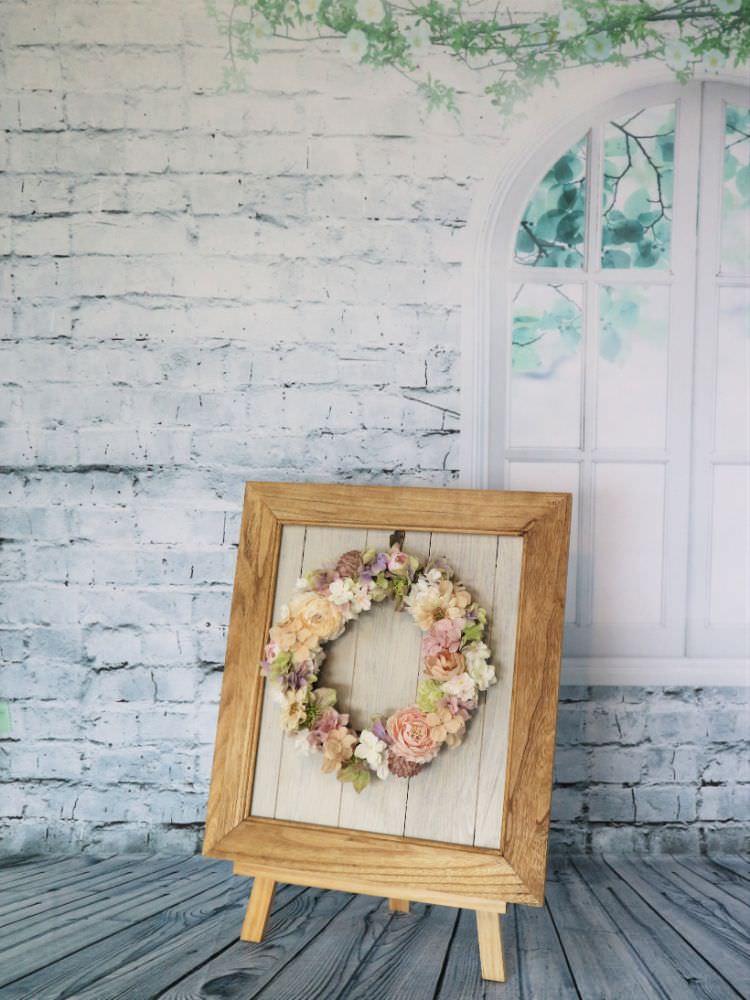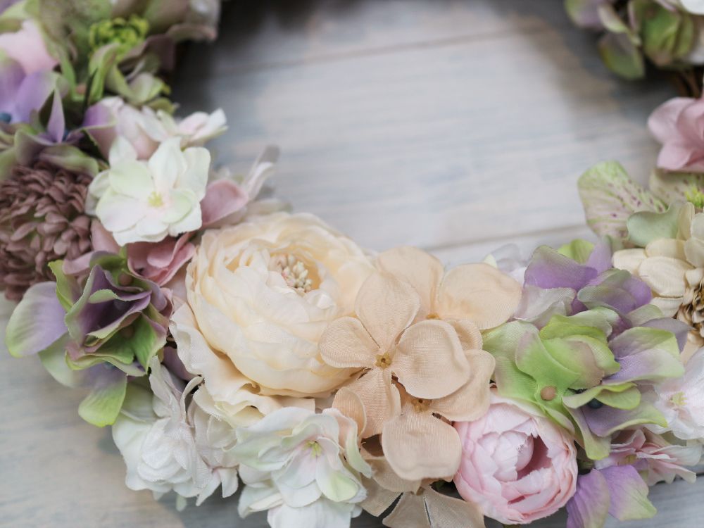 ニュアンスカラーをミックスした優しい色合いのリース。