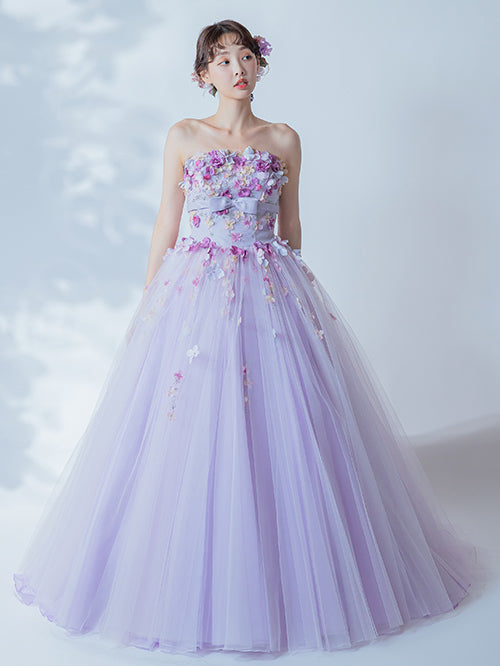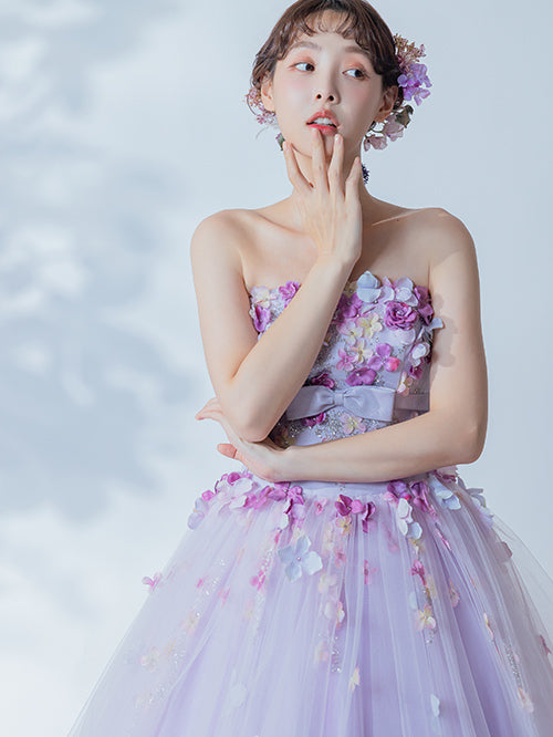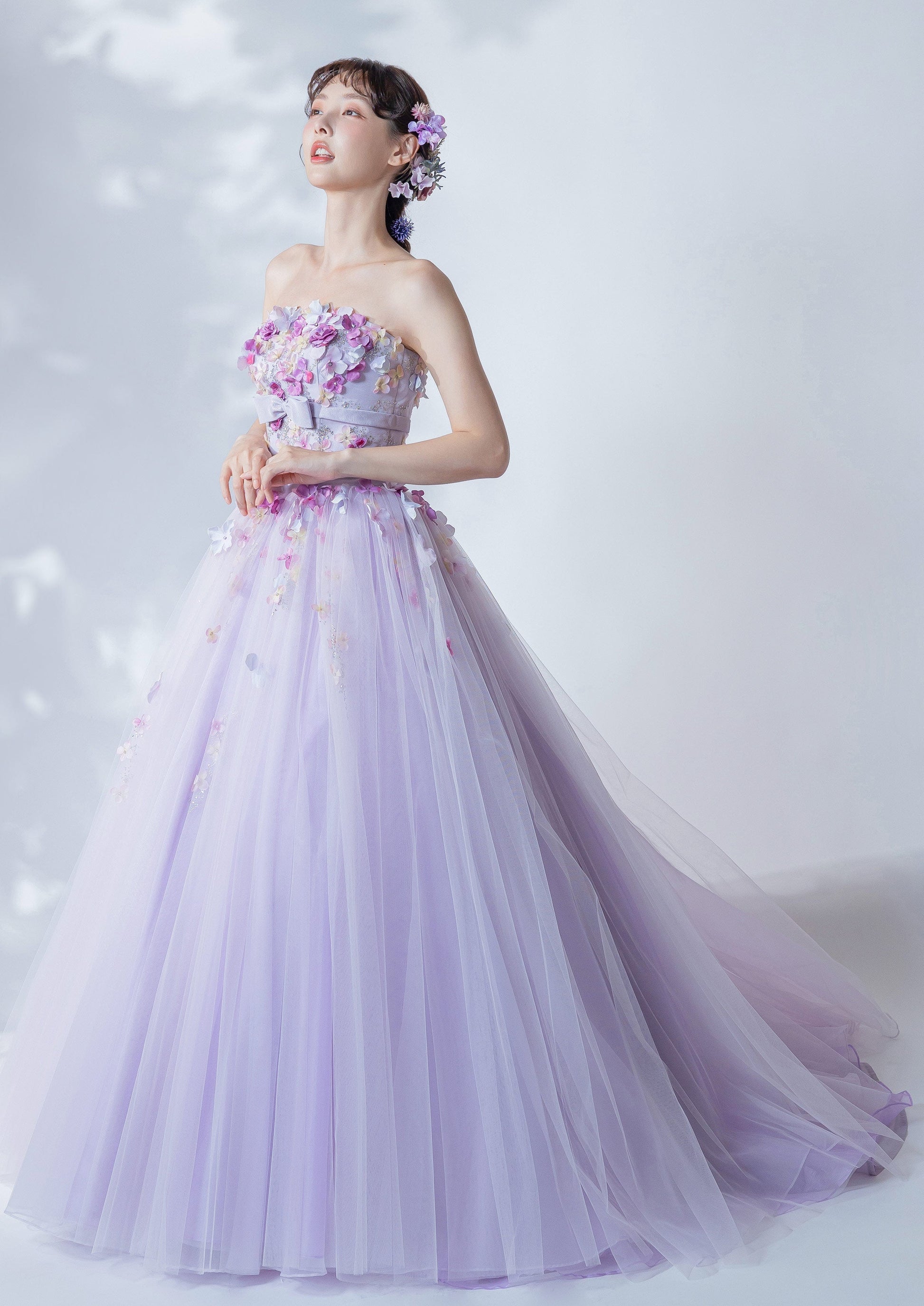 トレンドの3Dフラワーとキラキラ輝くグリッターを散りばめたお花ドレス。 バストの下にあしらったリボンはスタイルを良くみせてくれる効果も。肌映り の良いチェリーピンクと透き通るようなラベンダーカラーの2色展開です。