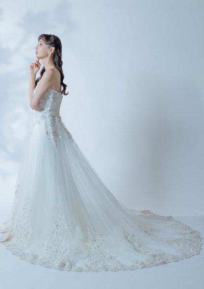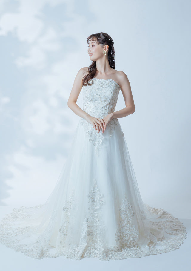 高級感ある刺繍レースを贅沢に使用したソフトマーメイドライン。ラインは 細身でもロングトレーンで華やかな印象に。パニエ不要のロングトレーンド レスは海外挙式にもおすすめです。