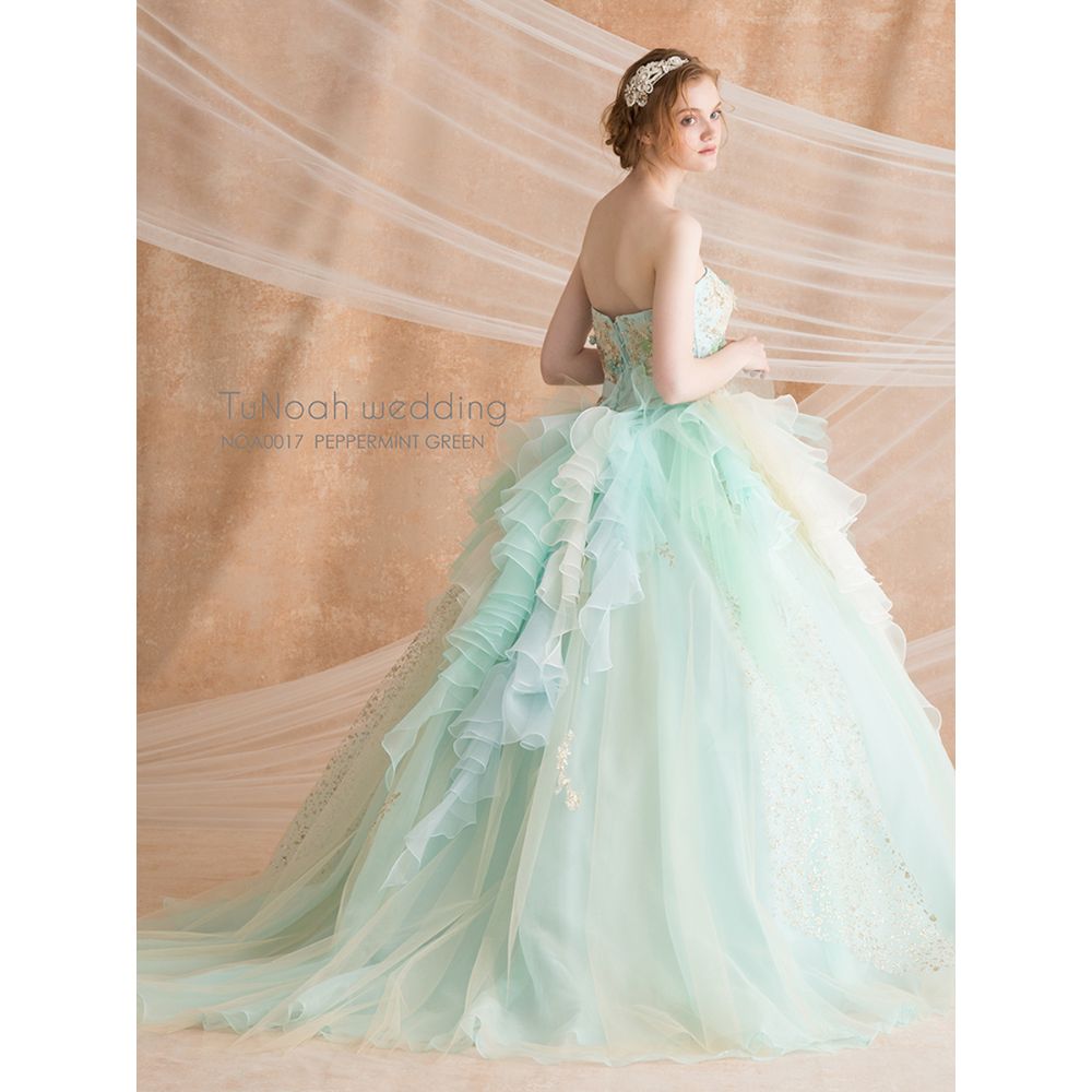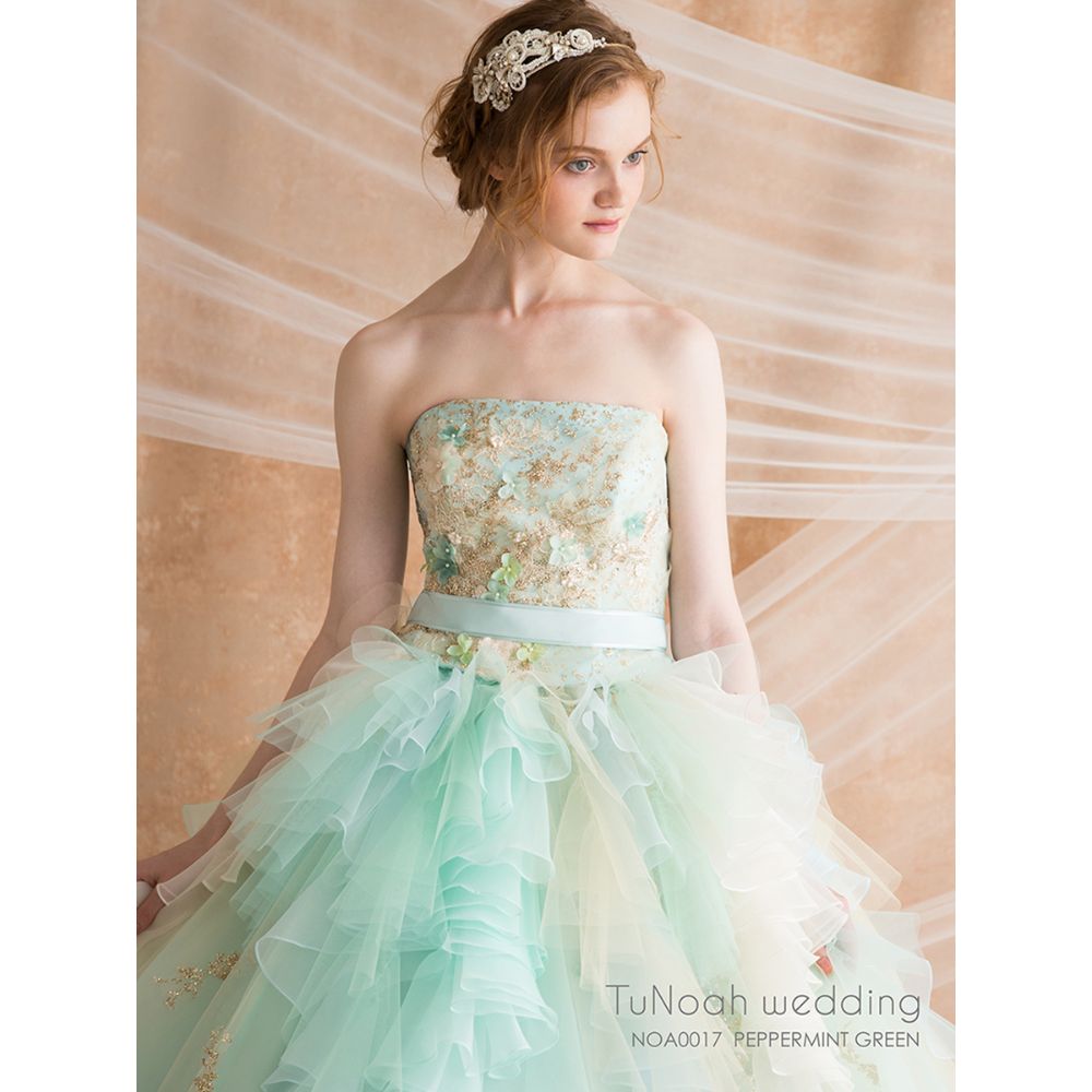 淡く優しいカラーにキラキラ光るゴールドのグリッターとゴールド刺繍のレ ースで高級感をプラスしました。スカートのフリルとグリッターが個性的。 カラー:イエロー・ペパーミントグリーン【着用パニエ】NOA0003