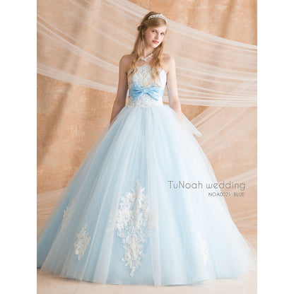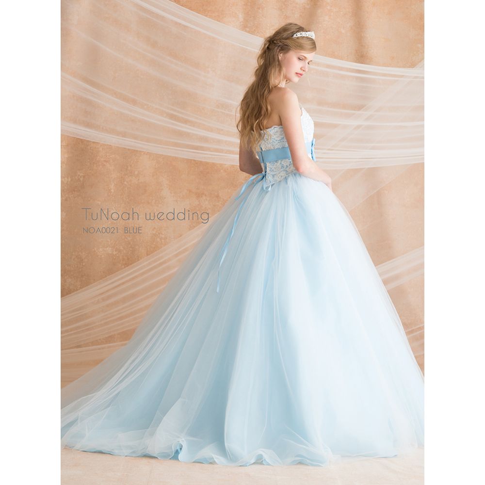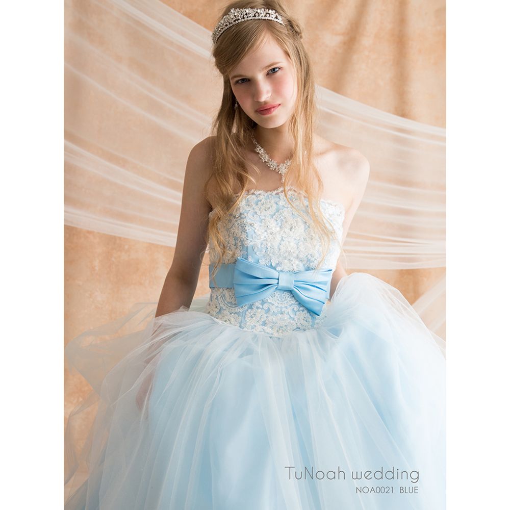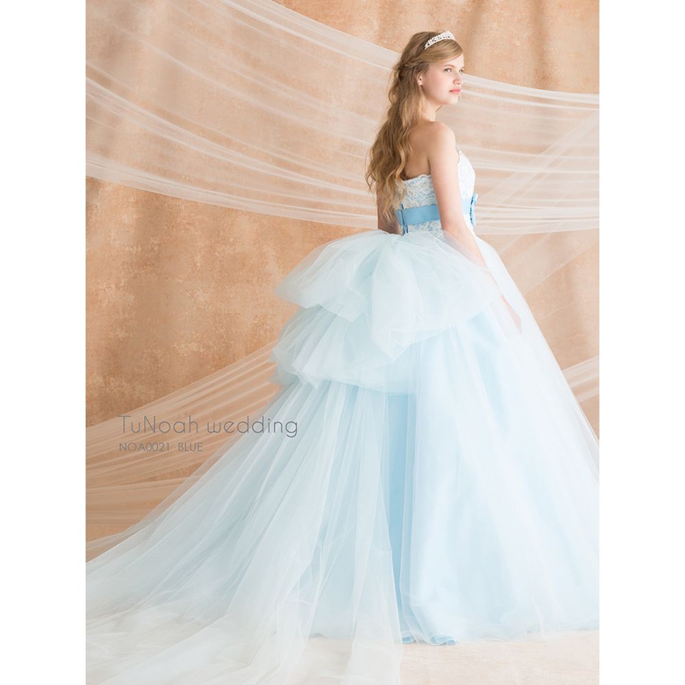 パステルトーンのブルーがノーブルな印象のふわふわチュールドレス。胸元 のリボンはビジューにも付け替えができます。オプションのフリルトレーン を付けるとさらに華やかに。※別売りトレーン【着用パニエ】NOA0003