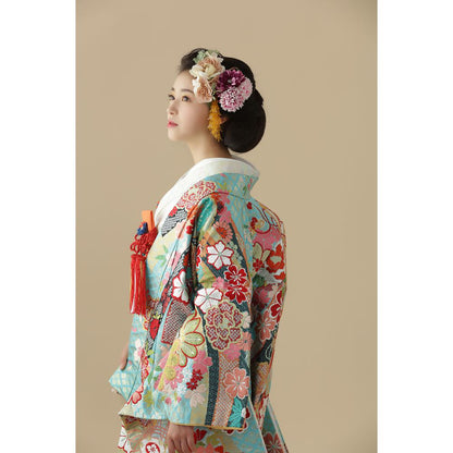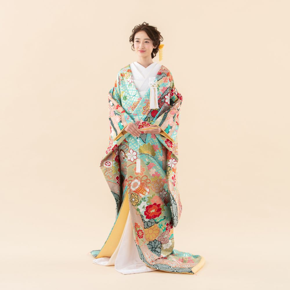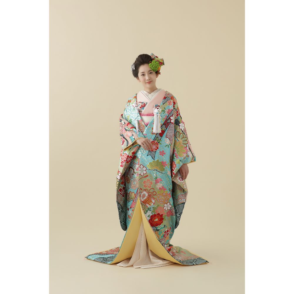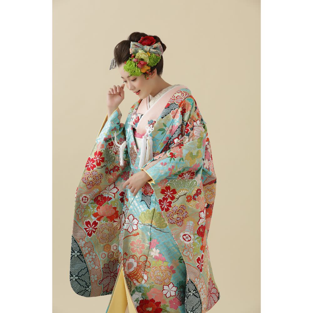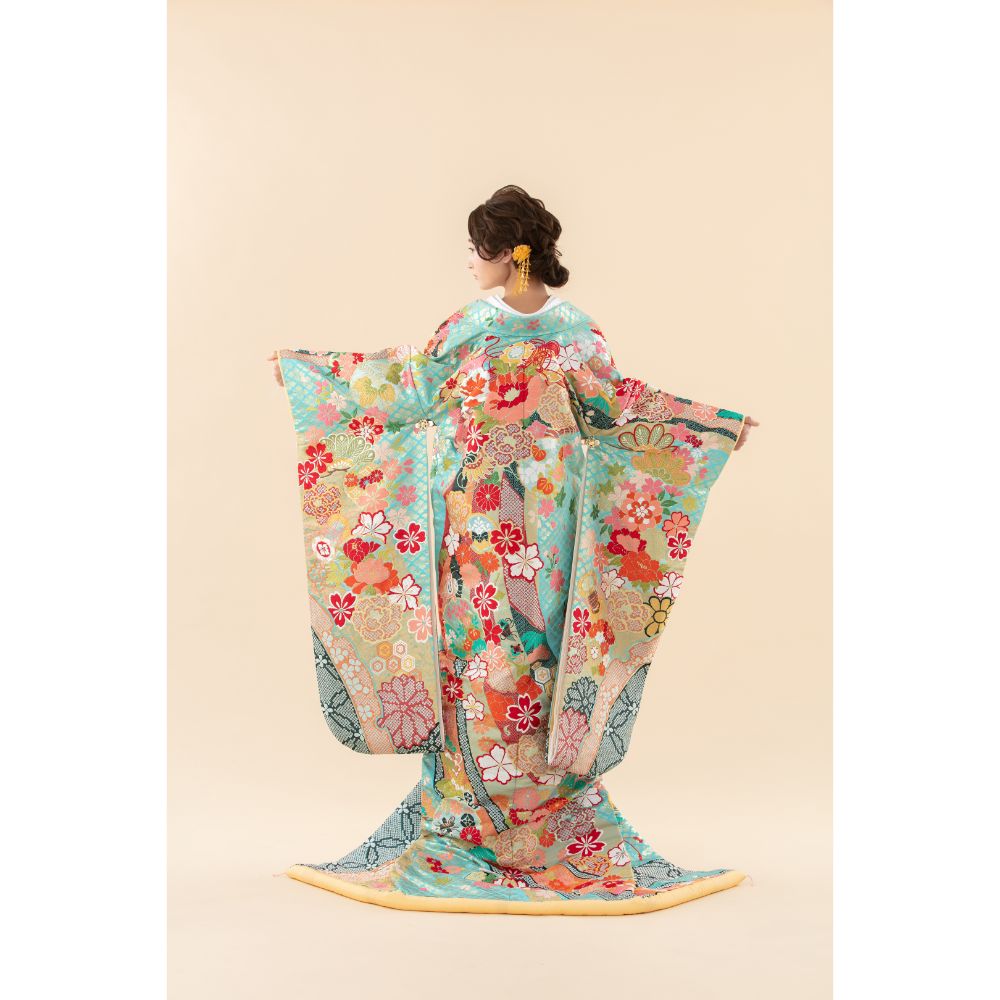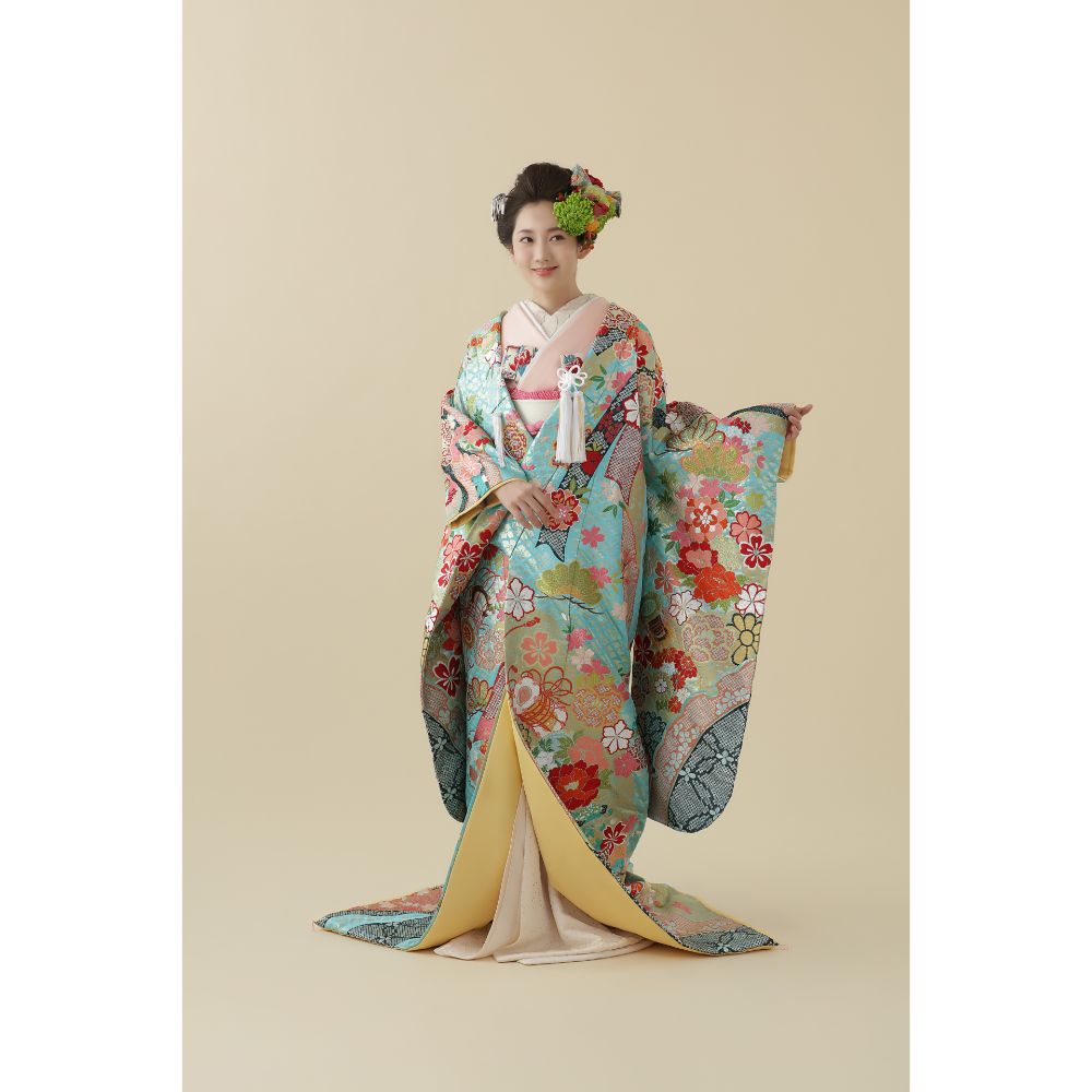 日本で古くから伝わる様々な吉祥文様がもどこされた豪華な一着。新しい門出を表す桜の文様をはじめとする花々の中に、人と人が”結び合う”意味を持つ大胆な熨斗柄が印象的。唐織であしらわれた立体的な伝統のある文様と、現代的な鮮やかでモダンな色使いが織りなす華やかな一着。