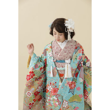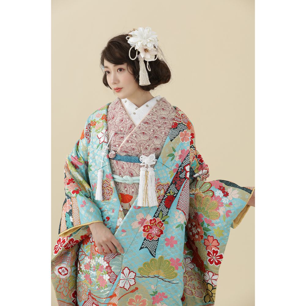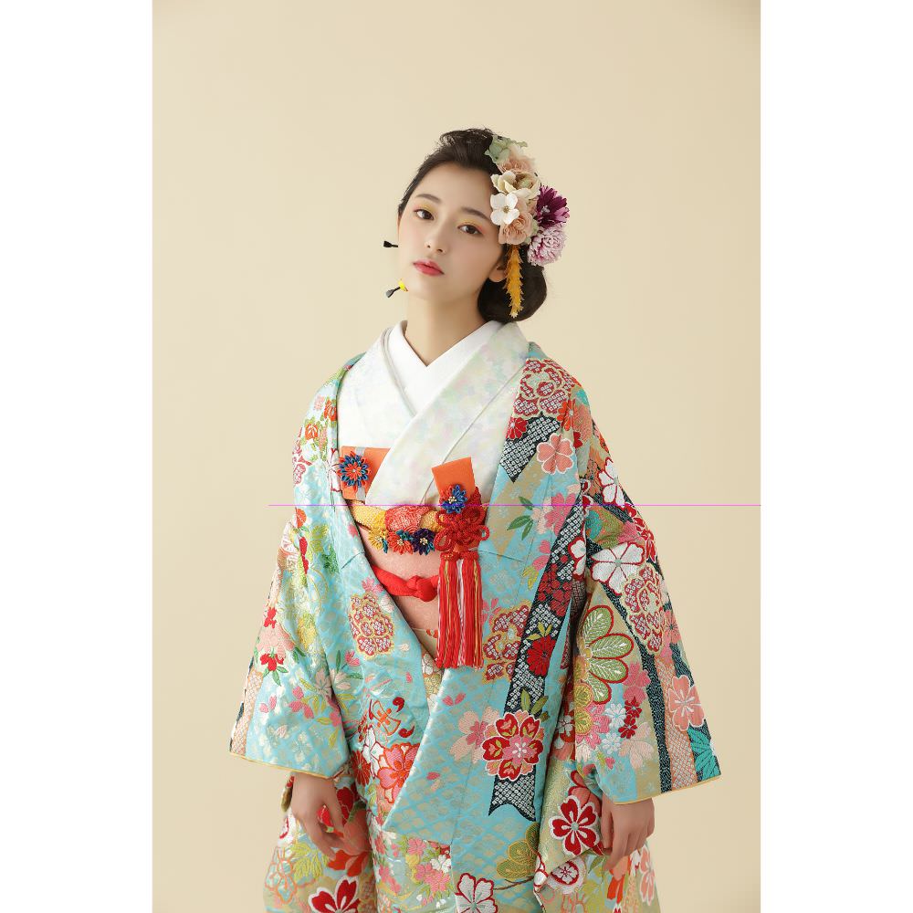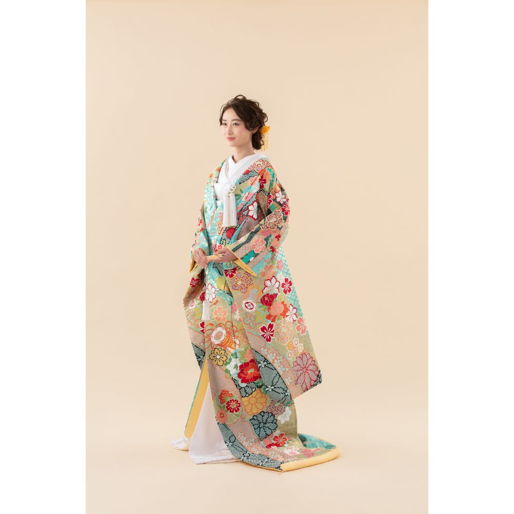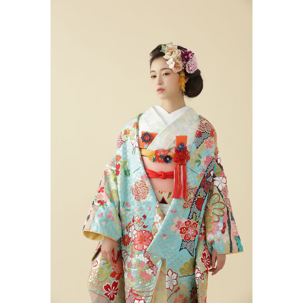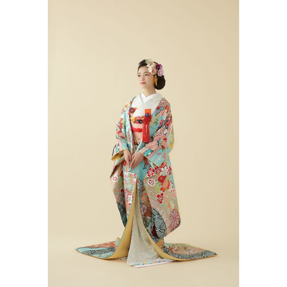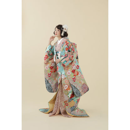 日本で古くから伝わる様々な吉祥文様がもどこされた豪華な一着。新しい門出を表す桜の文様をはじめとする花々の中に、人と人が”結び合う”意味を持つ大胆な熨斗柄が印象的。唐織であしらわれた立体的な伝統のある文様と、現代的な鮮やかでモダンな色使いが織りなす華やかな一着。