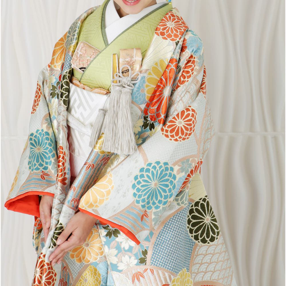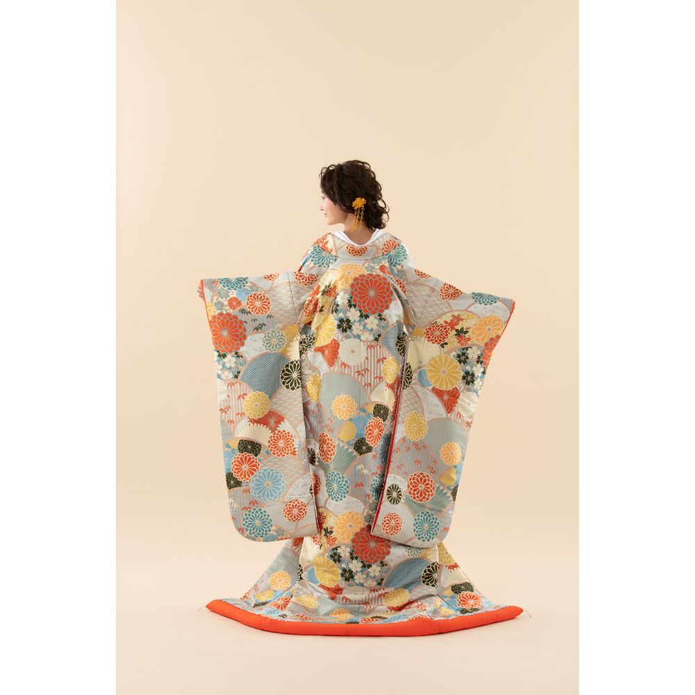 長寿や子孫繁栄の象徴とされる菊の花を全体にあしらい、”永遠に幸せが続きますように”との願いを込めた青海波柄とともに印象的に描かれた一着。古典的な文様を柔らかい色合いで表現し伝統的な中にも新婦様の柔らかさを引き出すモダンな雰囲気が印象的。