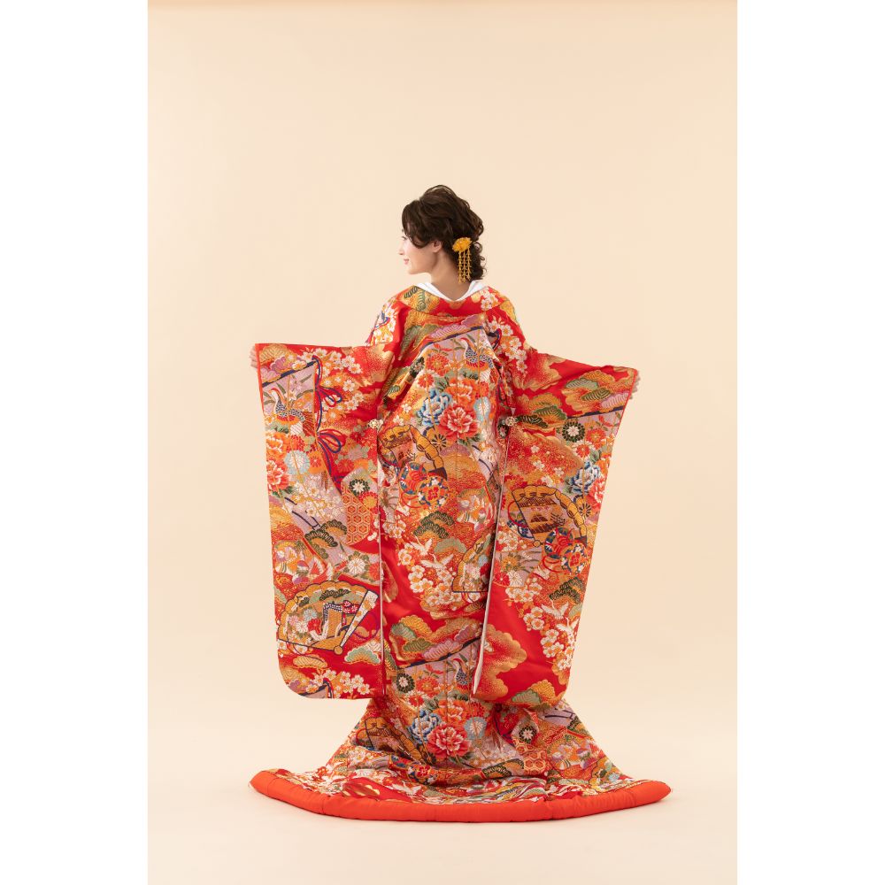 十二単のお姫様の装身具として、縁起の良い末広がりの形状から富の象徴とされる檜扇や豊かさや華やかさを表す御所車が吉祥文様の花々、延命長寿を表す鶴や夫婦の変わらぬ愛の象徴である鴛鴦が舞う優雅な一着。伝統が詰め込まれた柄と色合いに花嫁様の華やかさをより引き立つ一着。