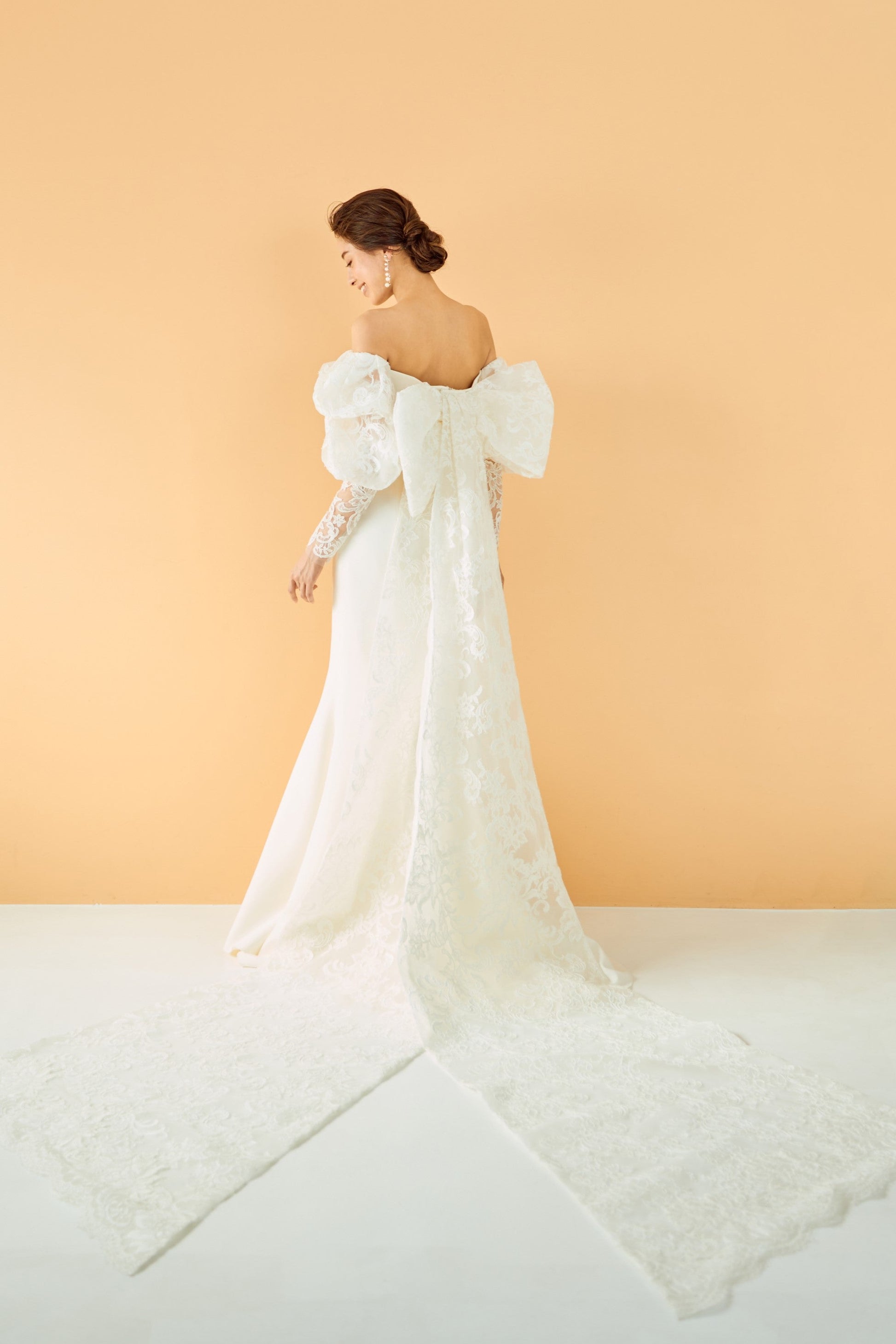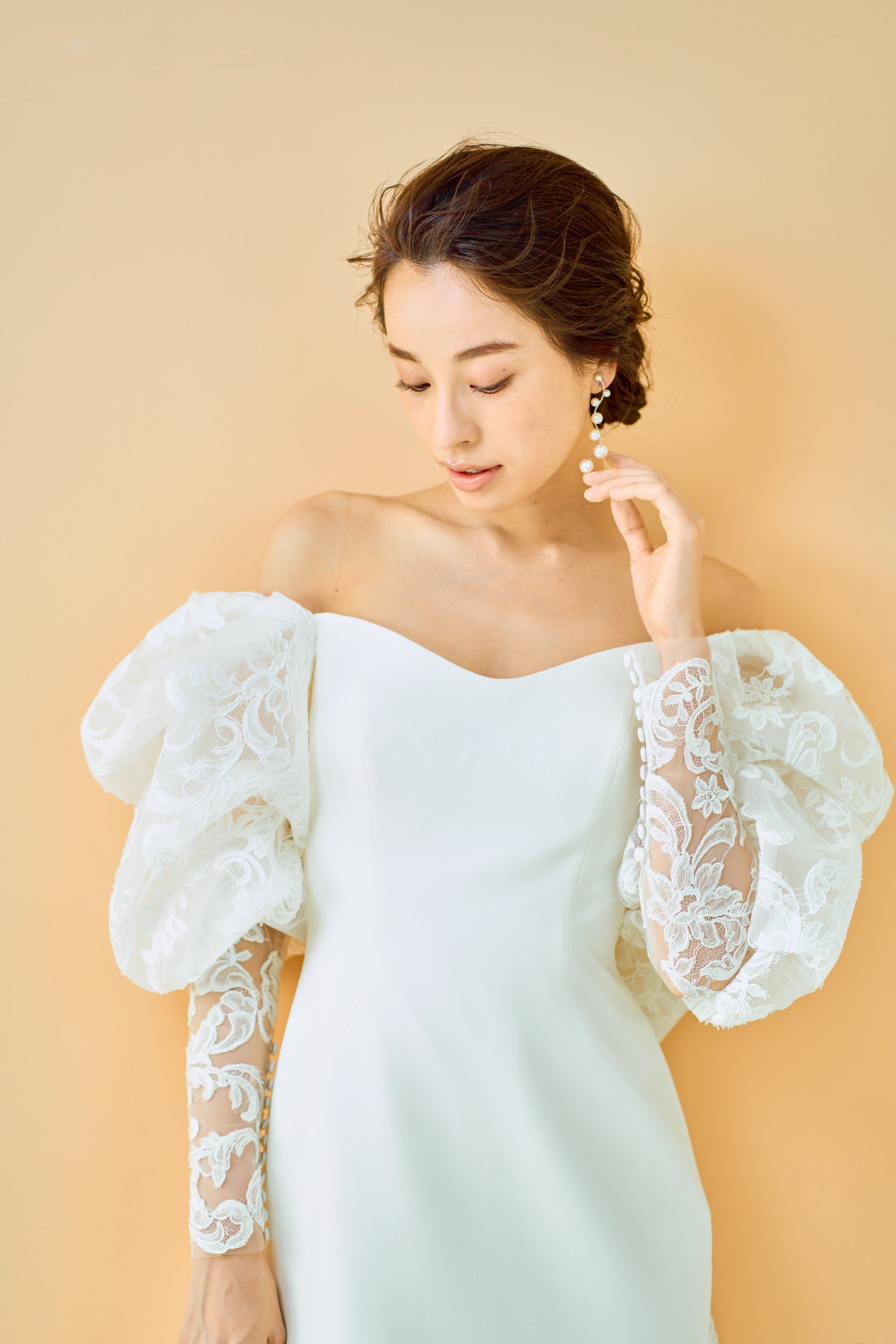 レースのロングパフスリーブが特徴的なマーメイドドレス。