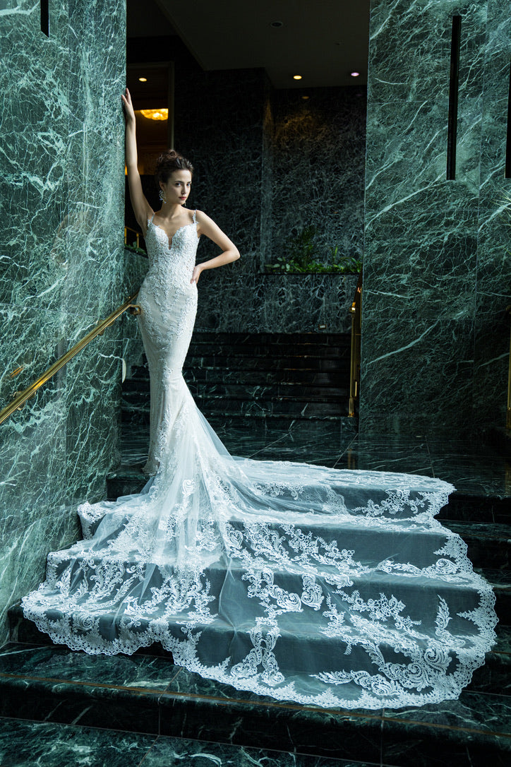 一際目立つロングトレーンのデザインカットとレースが綺麗で海外セレブの方にも喜ばれそうなドレスです。