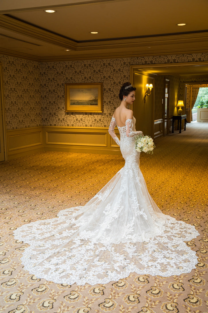 ラグジュアリーな空間でのセレモニーをイメージした総レースのマーメイドドレス。