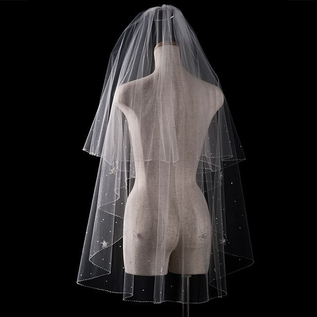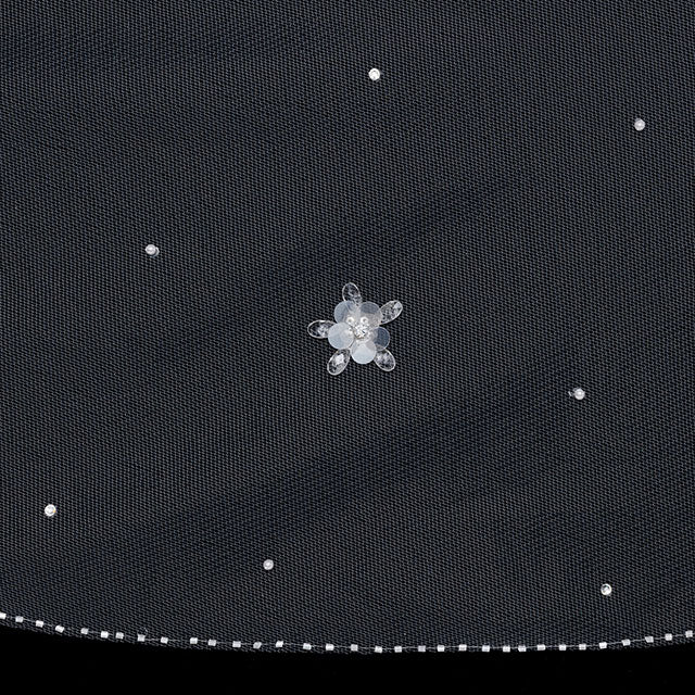 美しさを引き立てる特別なブライダルアクセサリー、【ウエディングベール】V3234-1(Sサイズ0.6+1M)の登場です!スパンコールのお花とクリスタル、パールが散りばめられたこのベールは、特別な日の装いにぴったりです。華やかなディテールがあなたの魅力を一層引き立て、思い出に残る素敵な瞬間を演出します。
