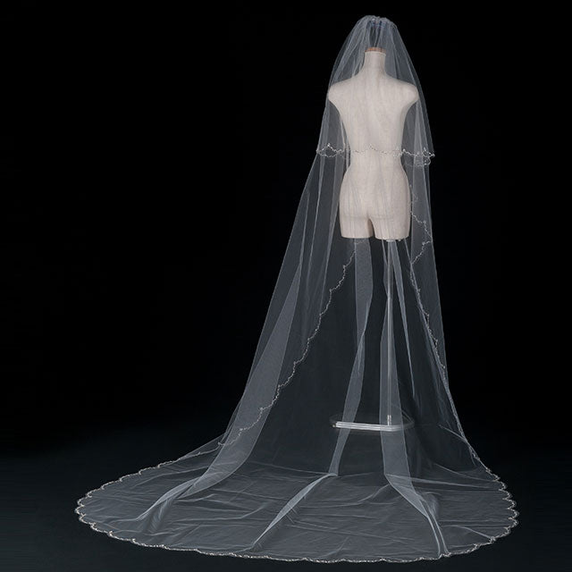 美しさを引き立てる特別なブライダルアクセサリー、【ウエディングベール】V3301-1(Lサイズ0.6+3M)の登場です!クリスタルとビーズ刺繍が華やかに縁取られたスカラデザインのこのベールは、特別な日の装いにぴったりのアイテムです。優雅なデザインが、あなたの美しさを一層引き立て、特別な瞬間を演出します。