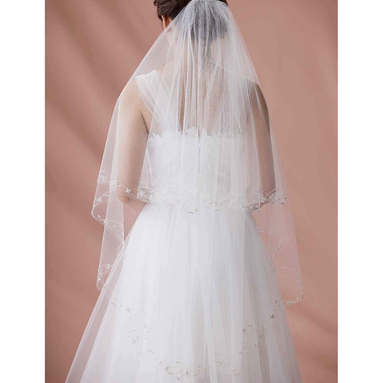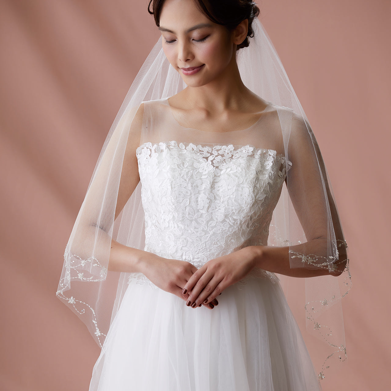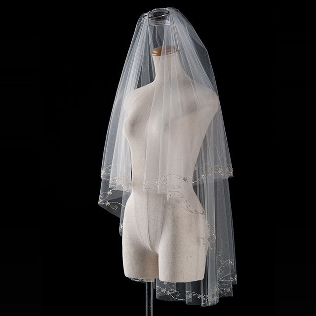 美しさを引き立てる特別なブライダルアクセサリー、【ウエディングベール】V3304-1(Sサイズ0.6+1M)の登場です!かわいらしいビーズ刺繍が施されたこのベールは、特別な日の装いにぴったりなアイテムです。愛らしいデザインが、あなたの美しさを一層引き立て、心に残る瞬間を演出します。
