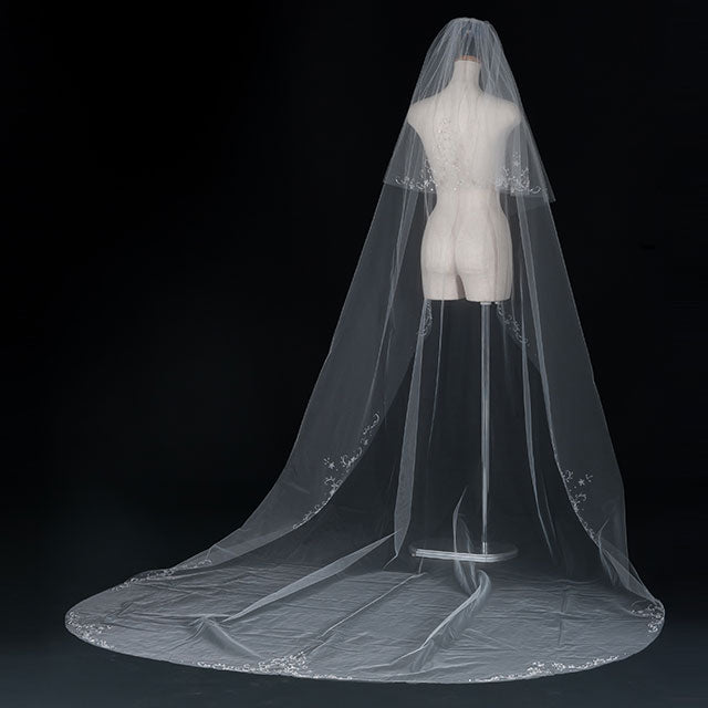 美しさを引き立てる特別なブライダルアクセサリー、【ウエディングベール】V3311-1(Lサイズ0.6+3M)の登場です!華やかなビーズでデザインされた刺繍が施されたこのベールは、特別な日の装いにぴったりのアイテムです。上品でありながら華やかなデザインが、あなたの美しさを一層際立たせ、心に残る瞬間を演出します。