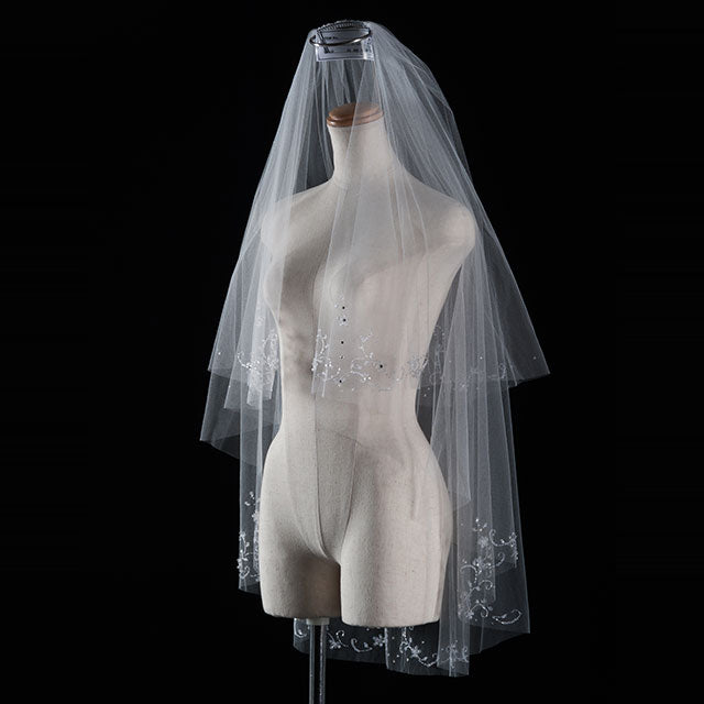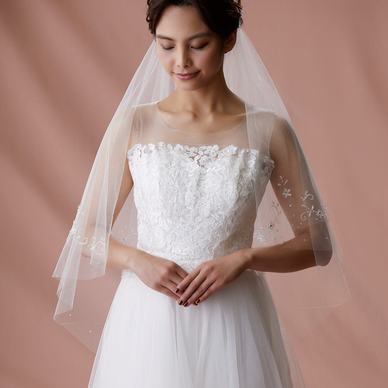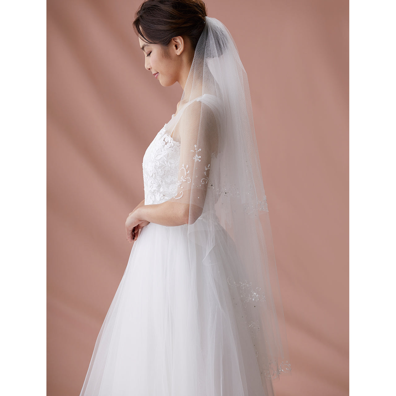 美しさを引き立てる特別なブライダルアクセサリー、【ウエディングベール】V3312-1(Sサイズ0.6+1M)の登場です!華やかなビーズでデザインされた刺繍が施されたこのベールは、特別な日の装いにぴったりのアイテムです。上品でありながら華やかなデザインが、あなたの美しさを一層際立たせ、心に残る瞬間を演出します。