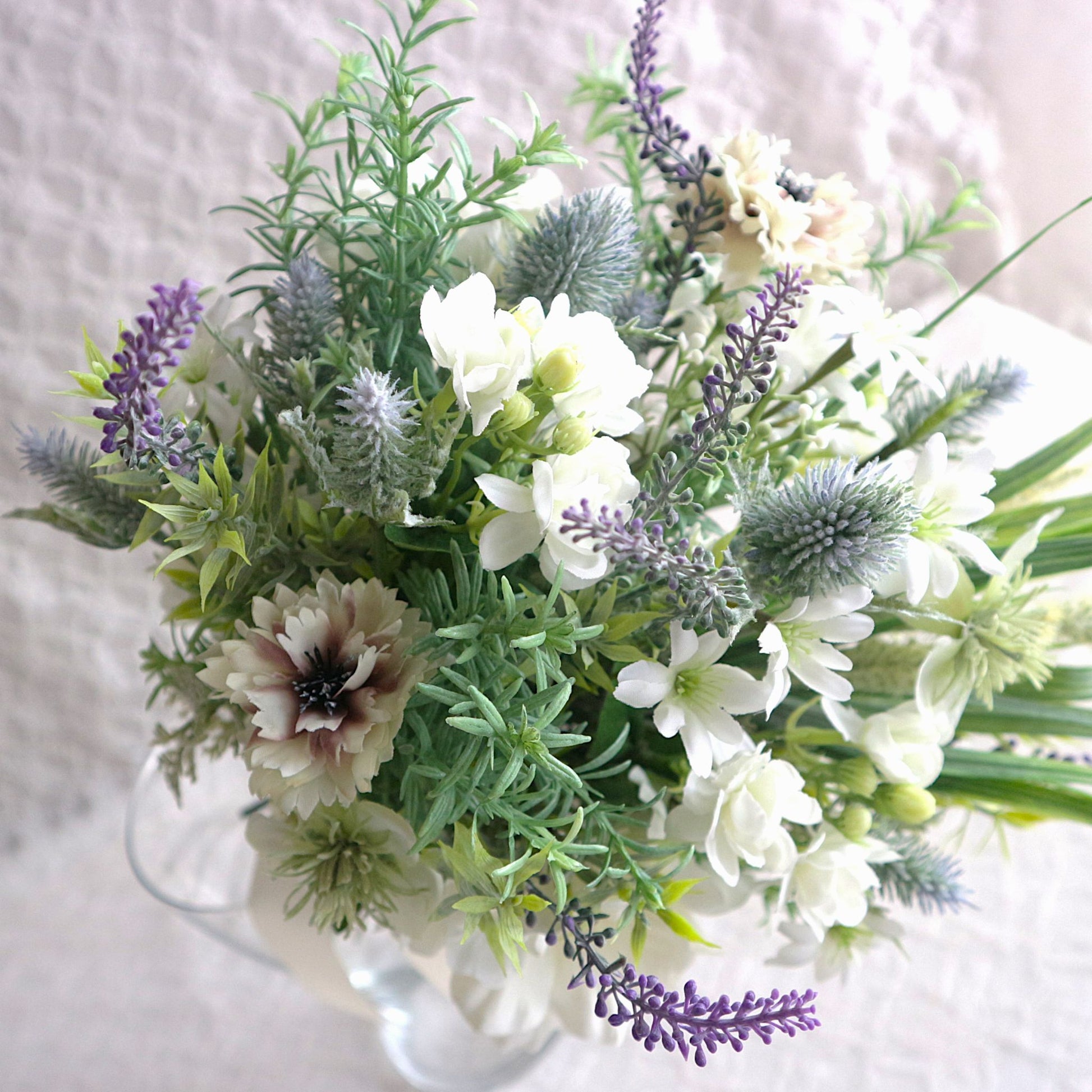 ローズマリーやラベンダーニゲラなどナチュラルテイストな草花をざっくり束ねて仕上げました。