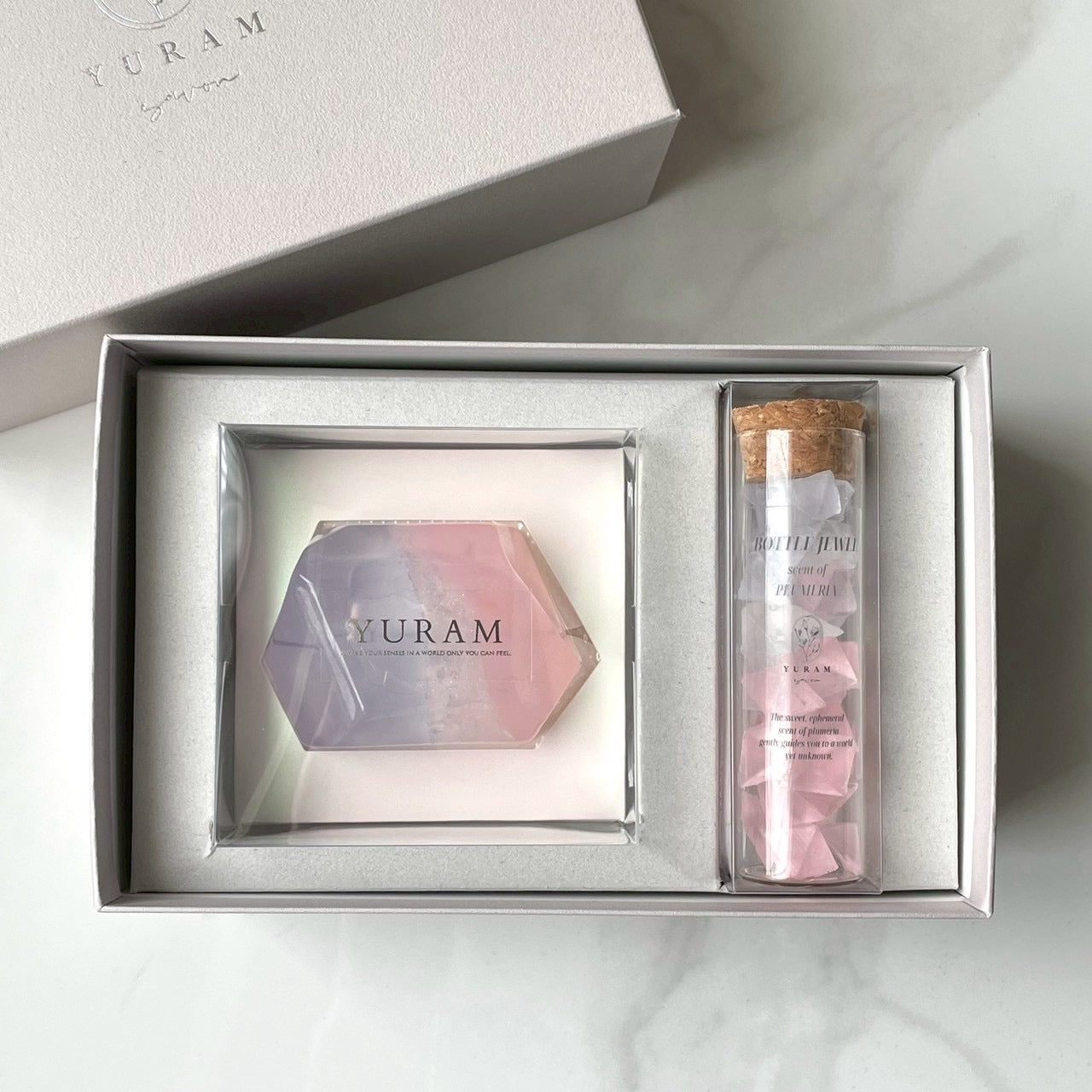 銀箔でYURAMロゴをあしらった、 上質で重厚感のある専用ギフトボックスにお入れしてお届けします。
