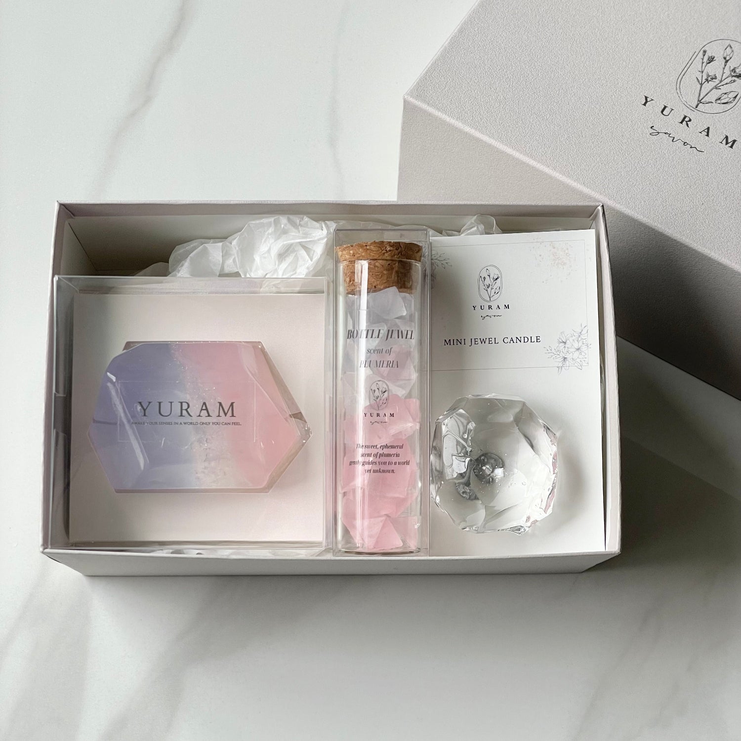 銀箔でYURAMロゴをあしらった、 上質で重厚感のある専用ギフトボックスにお入れしてお届けします。