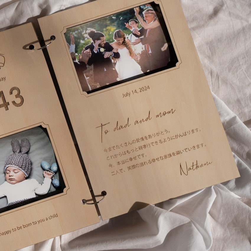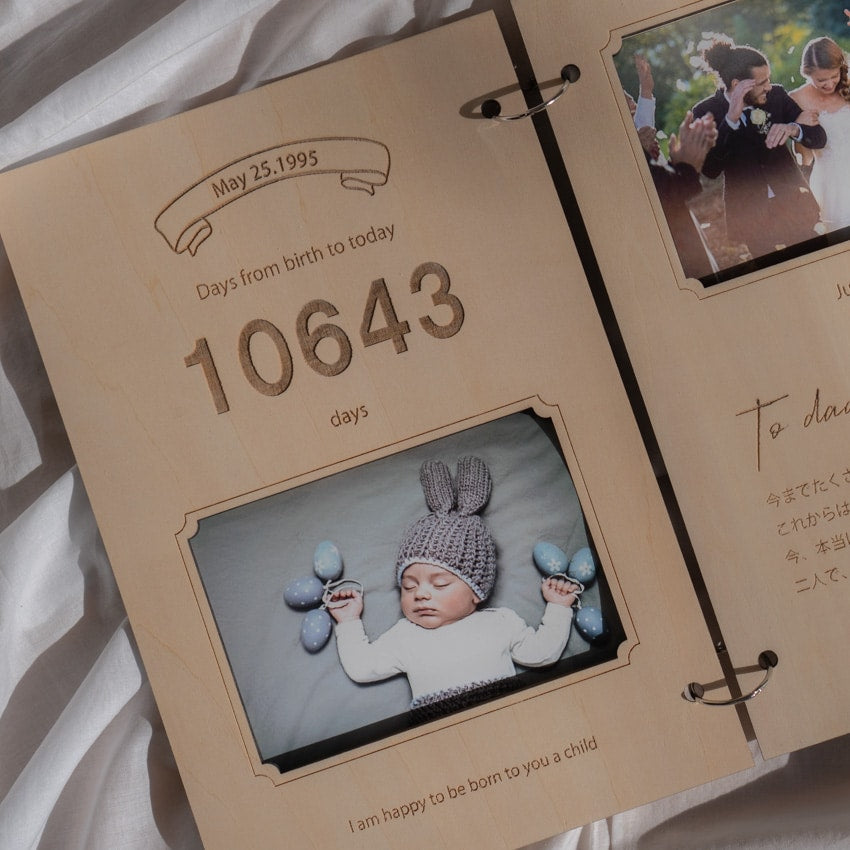 生まれたときの写真や、結婚式の写真を入れて完成します。