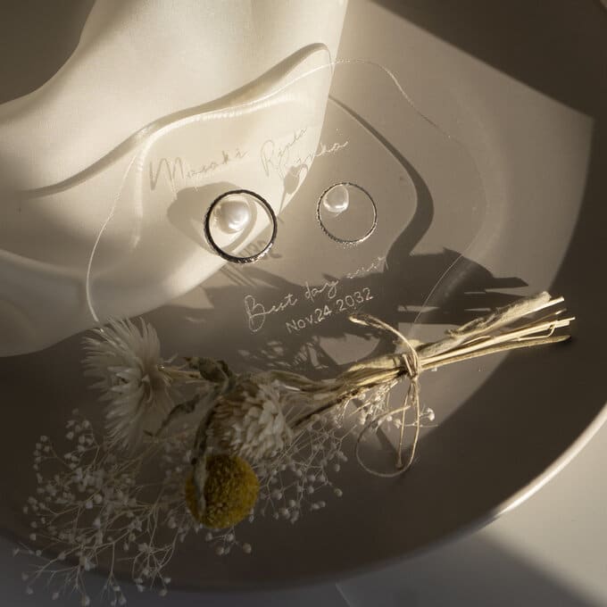 アクリルとバロックビーズのリングピローはテイストやテーマカラーを選びません。