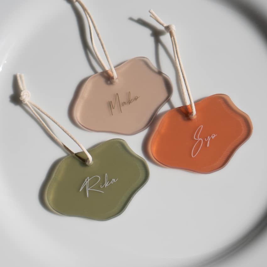 結婚式でお使いいただける席札ですが、式が終わったあともキーホルダーやネームプレート、ネームタグとしても長くお使いいただけます。