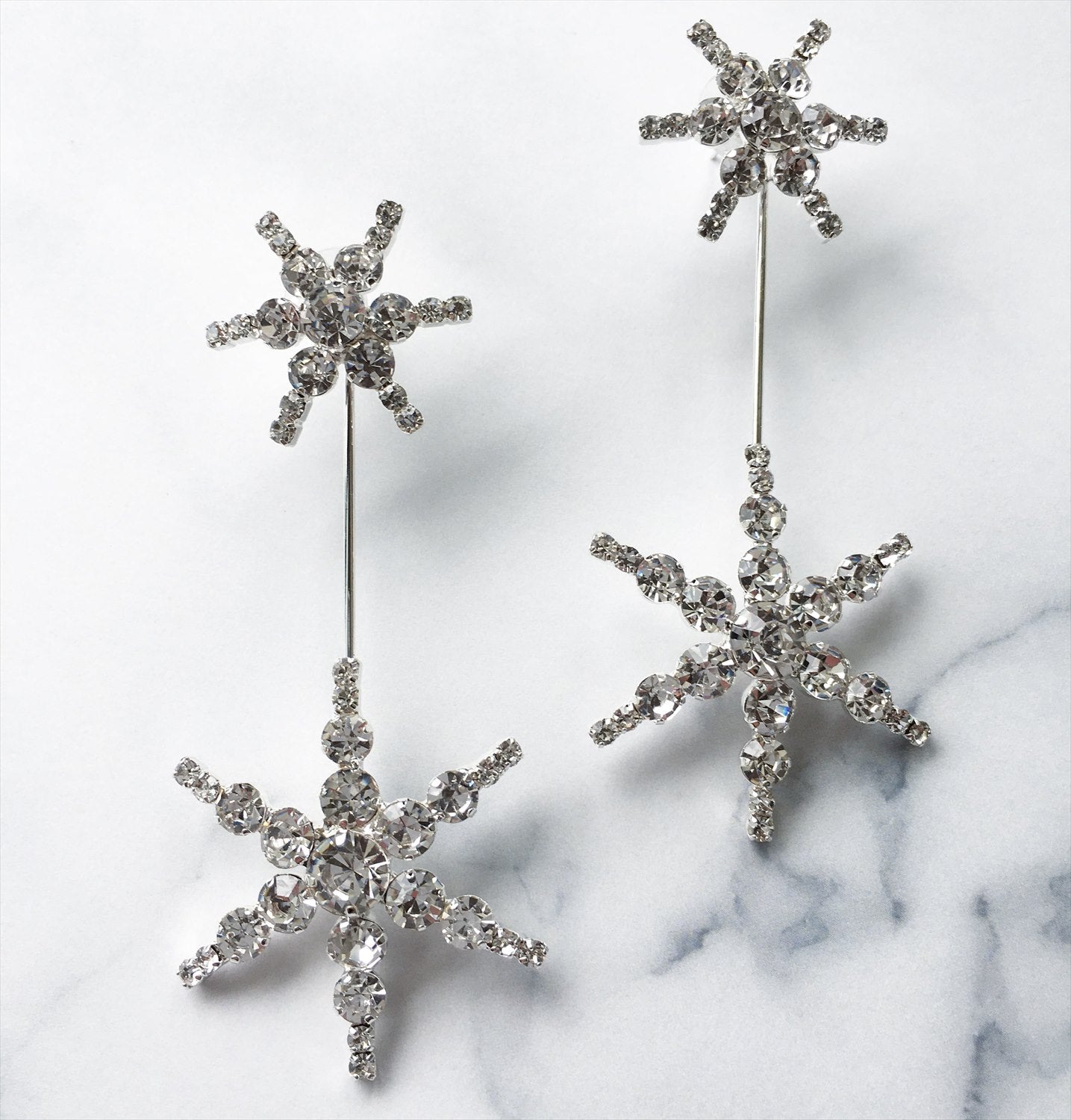 星型にかたどったモチーフにラインストーンとビジューをたっぷりと敷き詰め、大きい星と小さい星をシンプルなバー(スティック)で上下2連に重ねたロングシルエットは動くたびに揺れるロマンティックなデザインです。