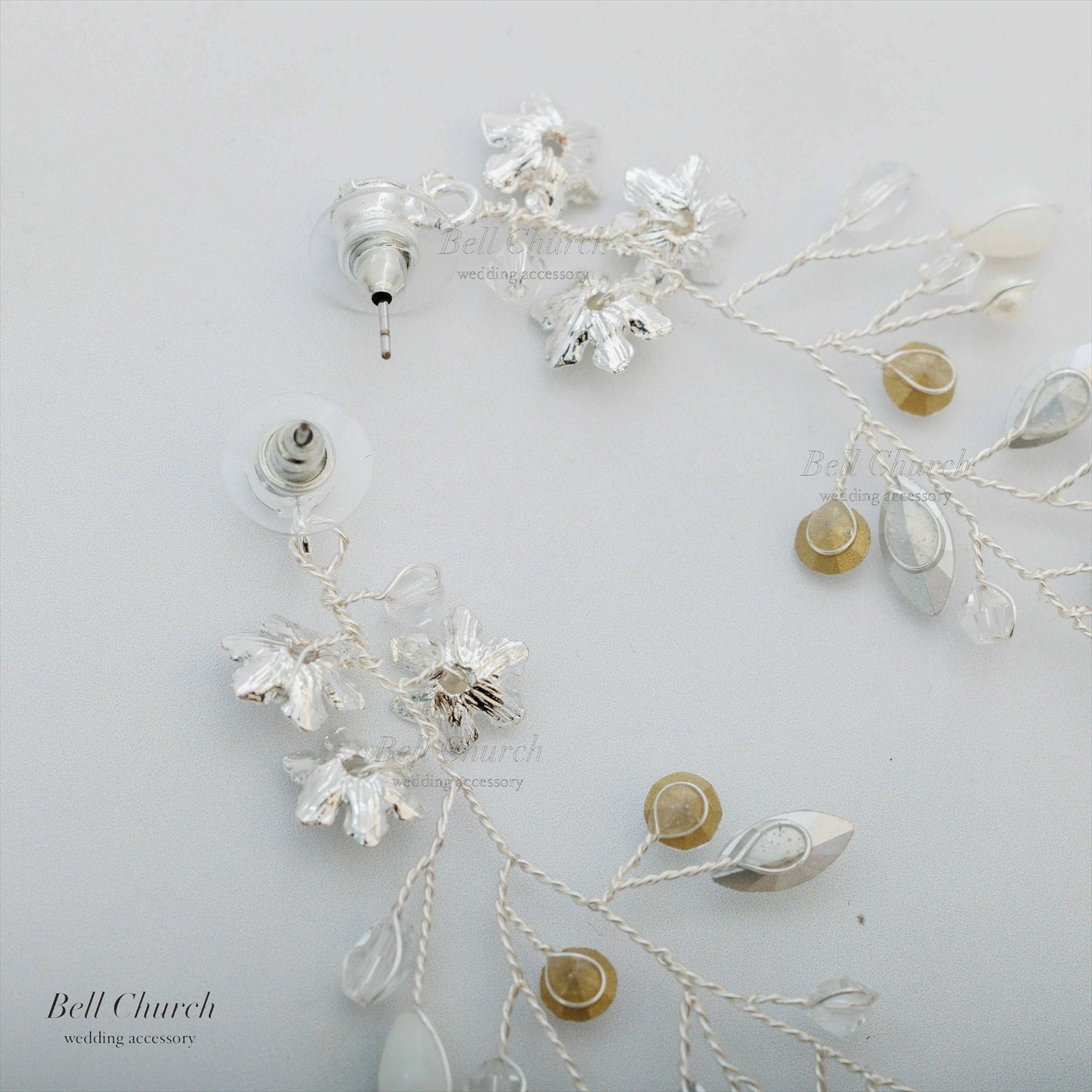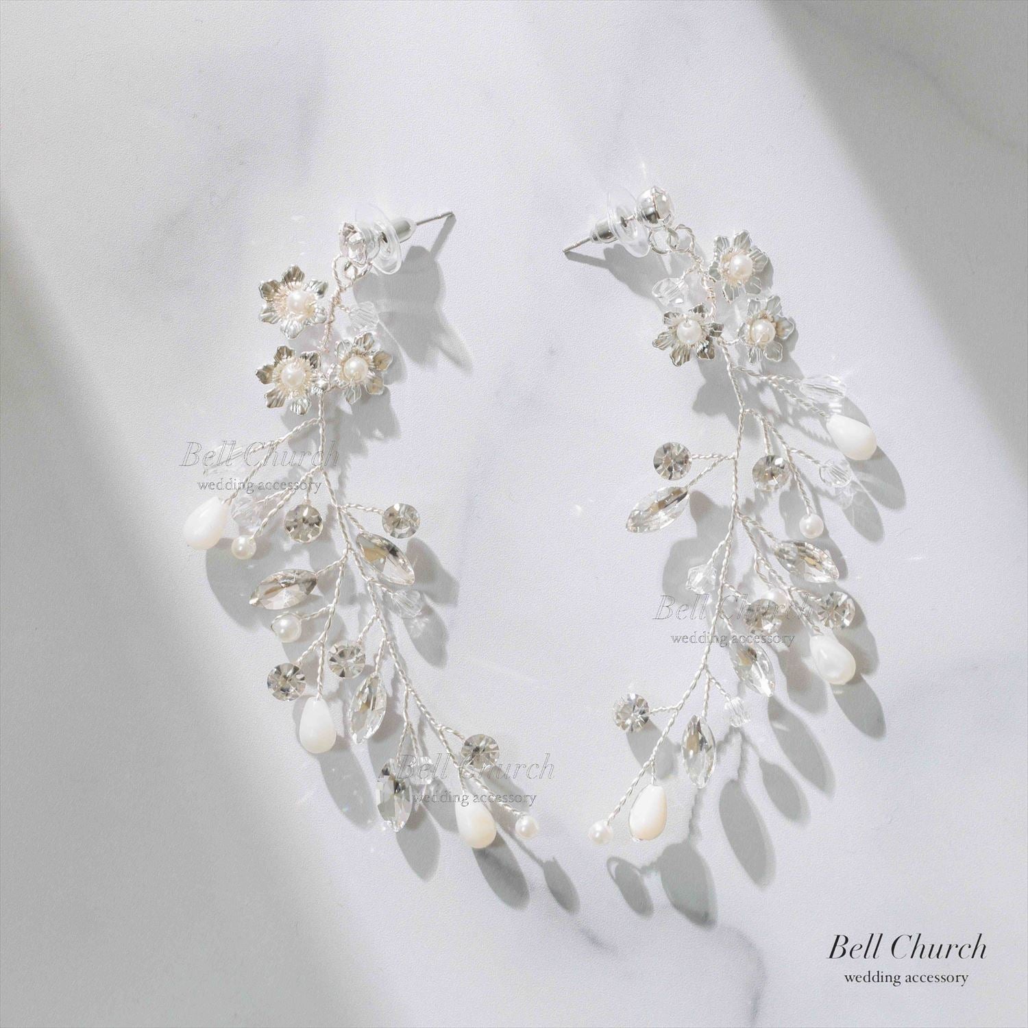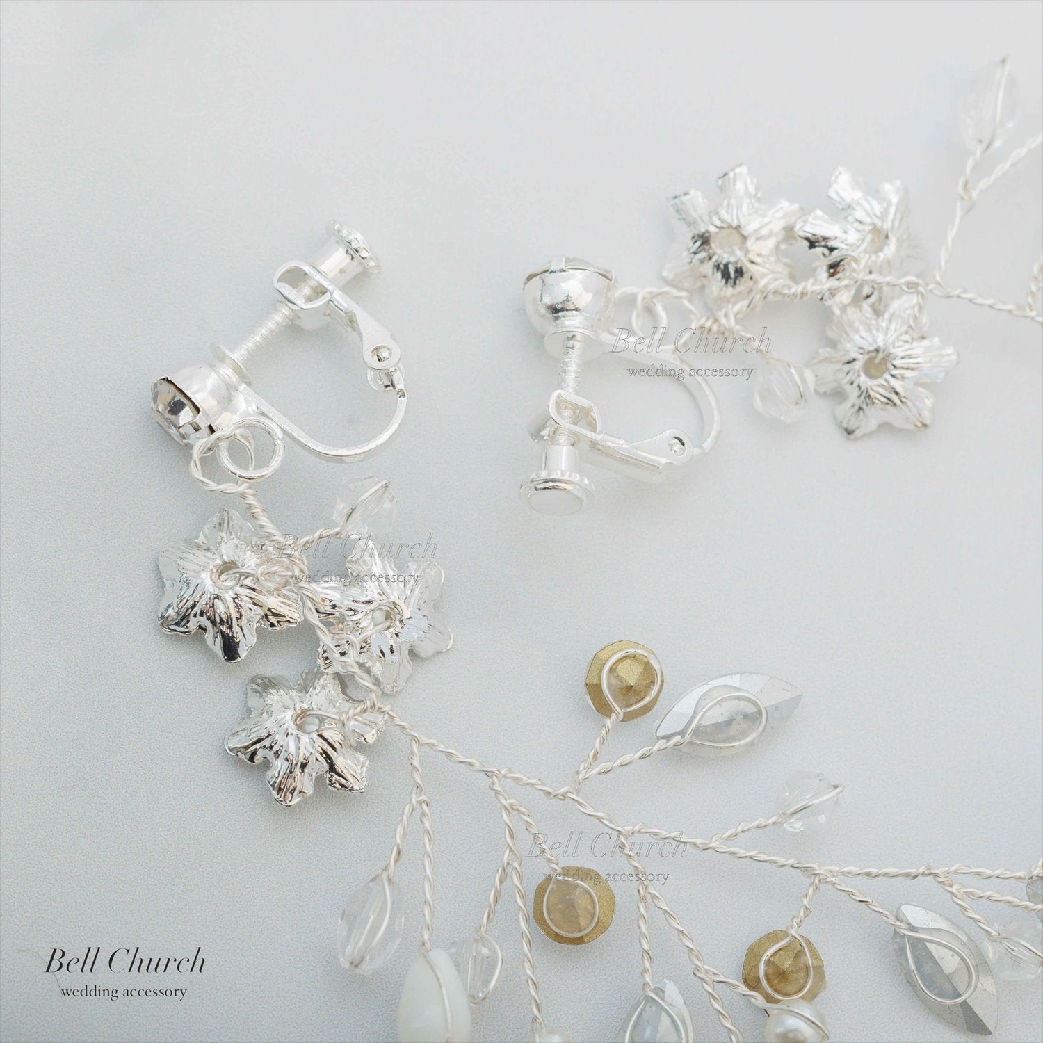 花嫁様の耳元ではシルバーで作られた小さなお花が控えめに咲き、お花の中心にはパールを上品に配置。